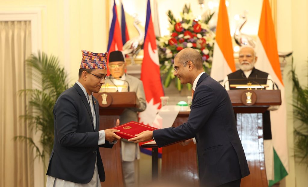 भारत भ्रमणमा रहेका प्रधानमन्त्री पुष्पकमल दाहाल प्रचण्ड र भारतीय समकक्षी नरेन्द्र मोदीको उपस्थितिमा उद्योग वाणिज्य तथा आपूर्तिमन्त्री रमेश रिजाल र उनका समकक्षी हर्दिप सिंह पुरीले हस्ताक्षर गरेका छन् ।