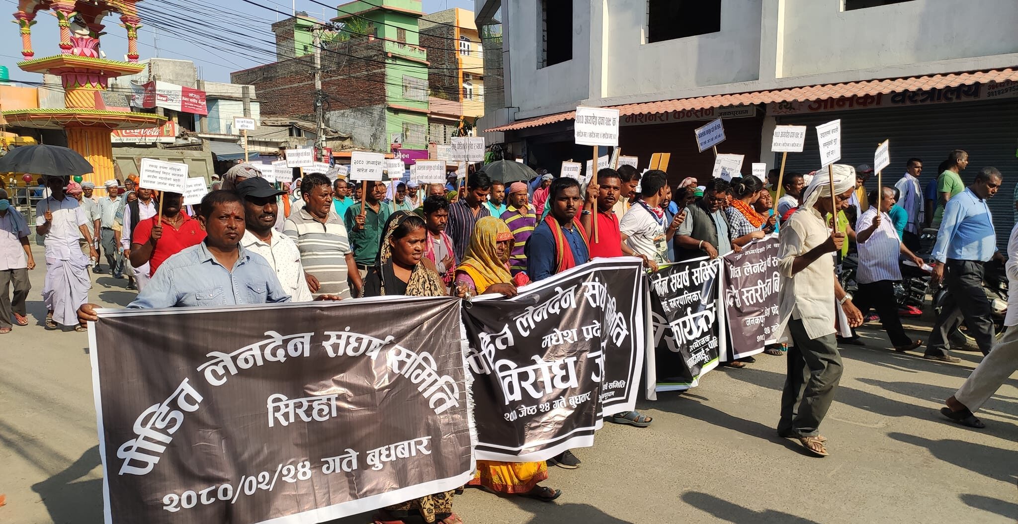 यी मागहरूसहित उनीहरूले रेल्वे स्टेशनबाट नारावाजी गरी नगरको विभिन्न भागको परिक्रमा गरेर पिडारी चोकमा गई चक्काजाम गर्दै कोणसभा गरेका थिए । समितिका अध्यक्ष विनोद यादवले समाजमा रहेका प्रत्येक मानवलाई दैनिक काम गर्नका लागी एक अर्कासँग कानुन बमोजिम लेनदेन गर्ने हक अधिकार मुलुकी देवानीसंहिता २०७४ को दफा ४७४ मा रहेको र सोही बमोजिम आफूहरूले पनि विभिन्न बैंक तथा वित्तीय संस्थाबाट ऋण लिएर समाजमा आवश्यक पर्ने व्यक्तिमा विगतदेखि नै प्रचलित कानुन बमोजिम आवश्यकता अनुसार ऋण लेनदेन गर्दै आएको बताए ।