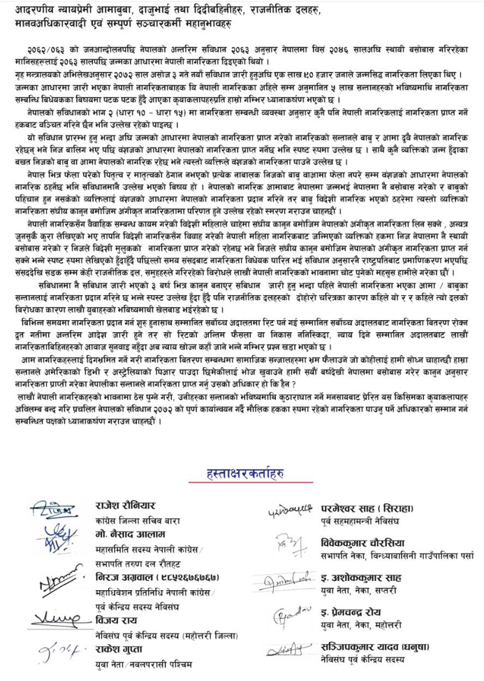 नेपाली कांग्रेस बाराका सचिव राजेश रौनियार, महासमिति सदस्य एवम् तरुण दल रौतहटका सभापति मो. नैसाद आलम, महाधिवेशन प्रतिनिधि एवम् नेविसंघका पूर्व केन्द्रिय सदस्य निरज अग्रवाल, नेविसंघका पूर्व केन्द्रिय सदस्य विजय राय, नवलपरासी पश्चिमका युवा नेता राकेश गुप्ता, नेविसंघका पूर्व सहमहामन्त्री परमेश्वर साह, विन्ध्याबासिनी गाउँपालिका पर्साका कांग्रेस सभापति विवेककुमार चौरसिया, नेपाली कांग्रेस सप्तरीका युवा नेता इ. अशोककुमार साह, नेपाली कांग्रेस महोत्तरीका युवा नेता इ. प्रेमचन्द्र रोय, नेविसंघका पूर्व केन्द्रिय सदस्य सञ्जिपकुमार यादवलगायतकाहरुले संयूक्त विज्ञप्तीमार्फत यस्तो माग गरेका छन् ।