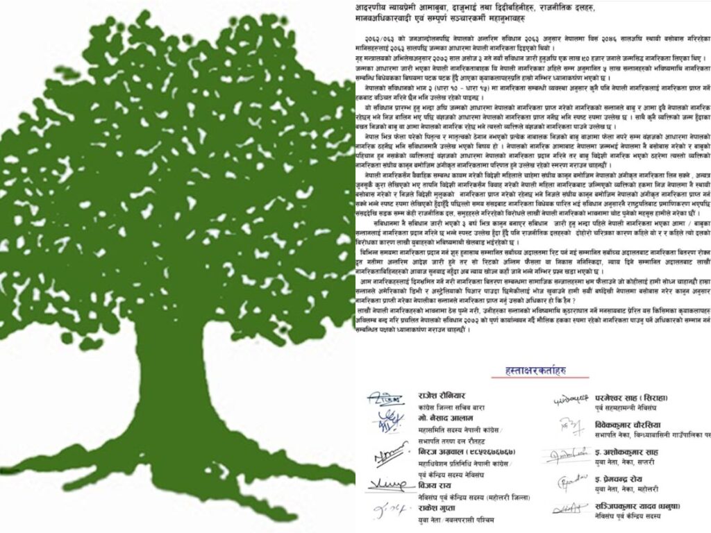 विज्ञप्तीमा भनिएको छ, ‘२०६२/०६३ को जनआन्दोलनपछि नेपालको अन्तरिम संविधान २०६३ अनुसार नेपालमा विसं २०४६ सालअघि स्थायी बसोबास गरिरहेका मानिसहरूलाई २०६३ सालपछि जन्मका आधारमा नेपाली नागरिकता दिइएको थियो । गृह मन्त्रालयको अभिलेखअनुसार २०७२ साल असोज ३ गते नयाँ संविधान जारी हुनुअघि १ लाख ५० हजार जनाले जन्मसिद्ध नागरिकता लिएका थिए । जन्मका आधारमा जारी भएका नेपाली नागरिकताबाहक यी नेपाली नागरिकका अहिलेसम्म अनुमानित ५ लाख सन्तानहरुको भविष्यमाथि नागरिकता सम्बन्धि विधेयकका विषयमा पटक पटक हुँदै आएका क्रियाकलापहरुप्रति हाम्रो गम्भिर ध्यानाकर्षण भएको छ । नेपालको संविधानको भाग २ (धारा १०, धारा १५) मा नागरिकता सम्बन्धी व्यवस्था अनुसार कुनैपनि नेपाली नागरिकलाई नागरिकता प्राप्त गर्ने हकबाट वञ्चित गरिने छैन भनि उल्लेख रहेको पाइन्छ । यो संविधान प्रारम्भ हुनुभन्दा अघि जन्मको आधारमा नेपालको नागरिकता प्राप्त गरेको नागरिकको सन्तानले बाबु र आमा दुवै नेपालको नागरिक रहेछन् भने निज बालिग भएपछि वंशजको आधारमा नेपालको नागरिकता प्राप्त गर्नेछ भनि स्पष्ट रुपमा उल्लेख छ । साथै कुनै व्यक्तिको जन्म हुँदाका बखत निजको बाबु वा आमा नेपालको नागरिक रहेछ भने त्यस्तो व्यक्तिले वंशजको नागरिकता पाउने उल्लेख छ ।’