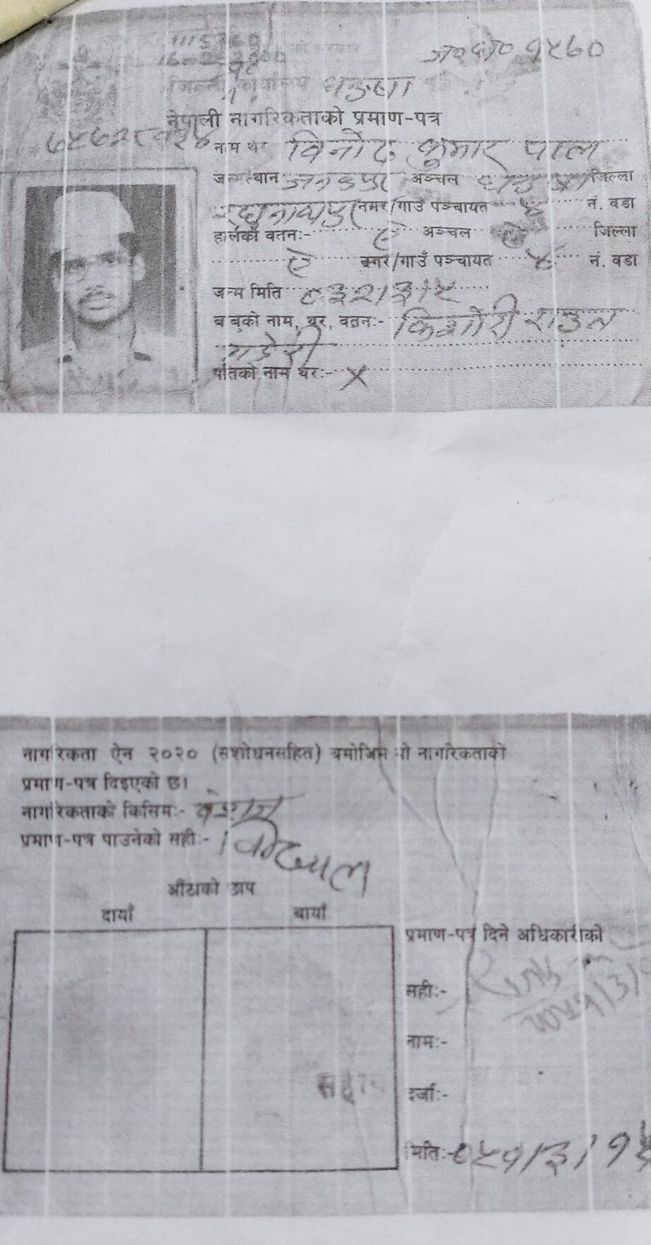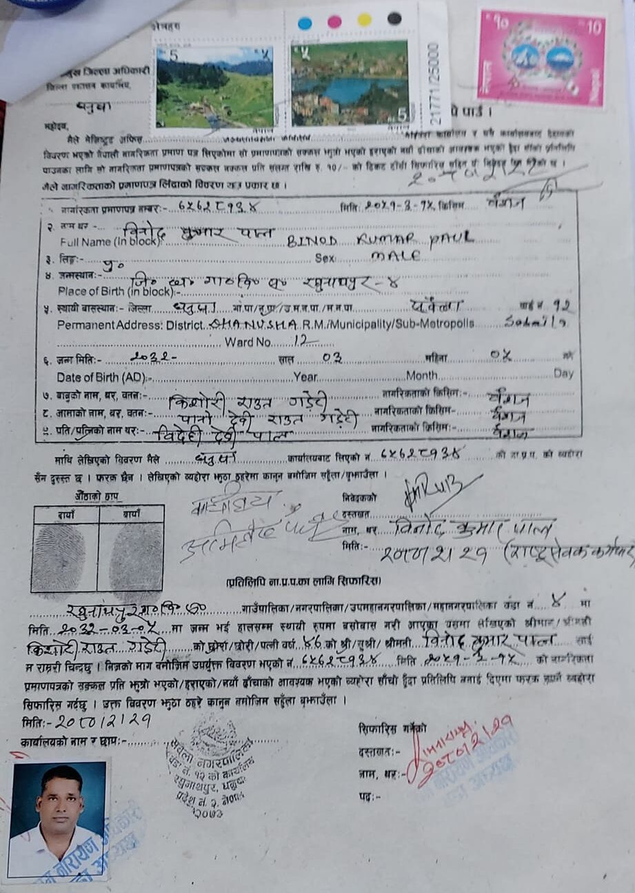 जनकपुरधाम, २६ जेठ । धनुषाको सबैला नगरपालिका वडा नम्बर–१२ बस्ने विनोद कुमार पाल नेपाल सरकारका कर्मचारी हुन् । उनले आजभन्दा ३० वर्ष पहिले नेपालको नागरिकता प्राप्त गरेका थिए । तर, संयोगवस केहीदिन अघि उनको त्यो नागरिकता हरायो ।