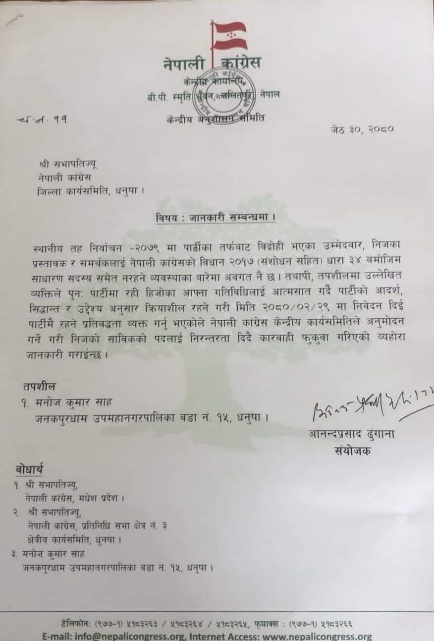 नगर प्रमुख साहको कांग्रेसभित्रको साविकको पदलाई निरन्तरता दिँदै कारवाही फुकुवा गरिएको हो ।
