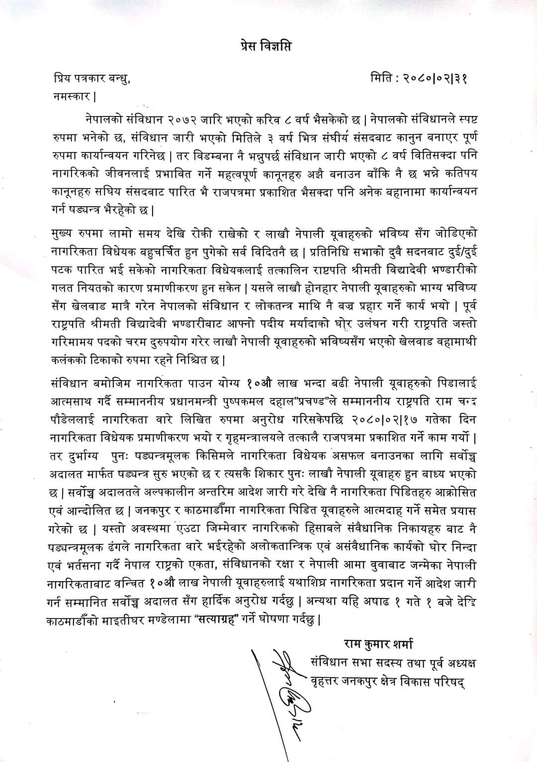 बुधबार जनकपुरधाममा पत्रकार सम्मेलनको आयोजना गर्दै नेता शर्माले नागरिकता प्रदान गर्ने आदेश अविलम्ब नआए असार १ गतेदेखि सत्याग्रहमा बस्न बाध्य हुने चेतावनी दिएका छन् ।