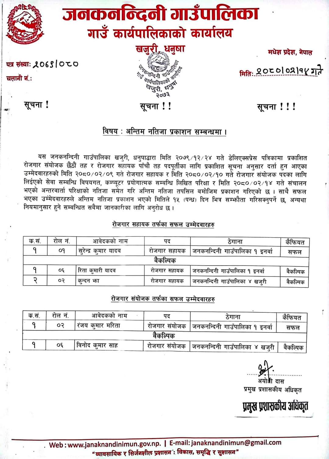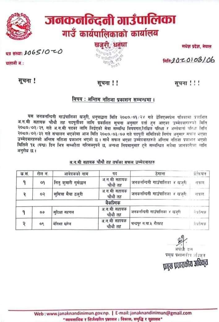 गत बैशाख २४ गते अनमि सहायक चौथो तह पदपूर्तिका लागि प्रकाशित सूचना अनुसार जेठ २९ गते लिइएको सेवा सम्बन्धी विषयगत, लिखित परीक्षा र अन्र्तवार्ता जेठ ३२ गते सञ्चालन भएकोमा असार ७ गते पदपूर्ति समितिको निर्णय अनुसार अनमि सहायक चौथो तहमा प्रमुख प्रशासकिय अधिकृत अयोधी दासकी बुहारी नितु कुमारी गुर्मछान र उपाध्यक्ष कमला सहगलकी बुहारी सुमित्रा मैया ठकुरीलाई सफल उम्मेदवार घोषित गरिएको छ । अन्य उम्मेदवारहरु सुदिक्षा सहगल र बैनिशा खरेलको नाम वैकल्पिकमा राखिएको छ ।