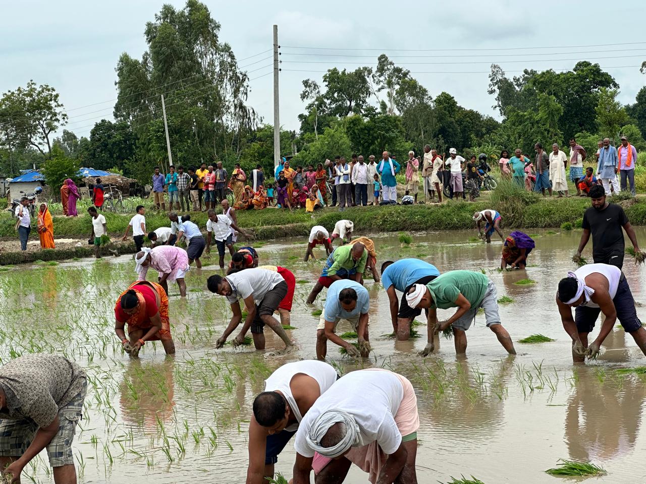 धनुषाको धनुषाधाम नगरपालिका–८ कुम्हरा टोलस्थित किसान महासंघले आयोजना गरेको कार्यक्रममा सभामुख मण्डल धान खेतमै परम्परागत शैलीमा धान रोप्दै गरेको भेटिएका हुन् ।