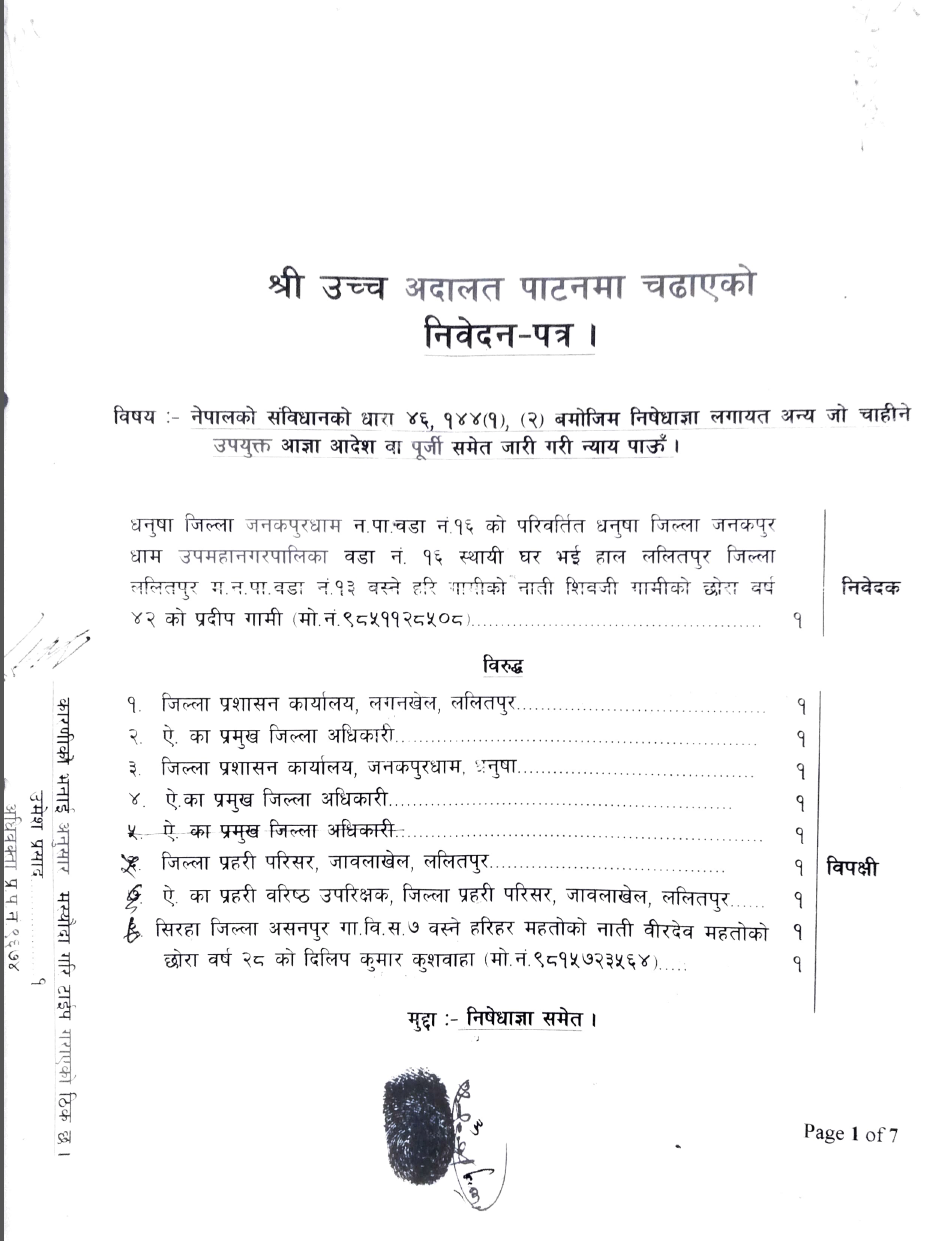 उनले कहिले धनुषा प्रशासन र कहिले ललितपुरका प्रहरी प्रशासनले निरन्तर धाकधम्कीसहित दुःख दिन थालेपछि न्यायका लागि अदालतको शरण लिनु परेको बताए ।