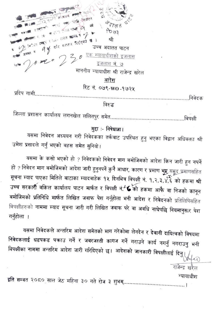 लेनदेन र देवानी दायित्वको विषयमा प्रदिप गामीलाई धडपकड गर्ने र जबर्जस्ती कागज गराउने कार्य नगर्न विपक्षीका नाममा उच्च अदालतले अन्तरिम आदेश गरेको छ ।