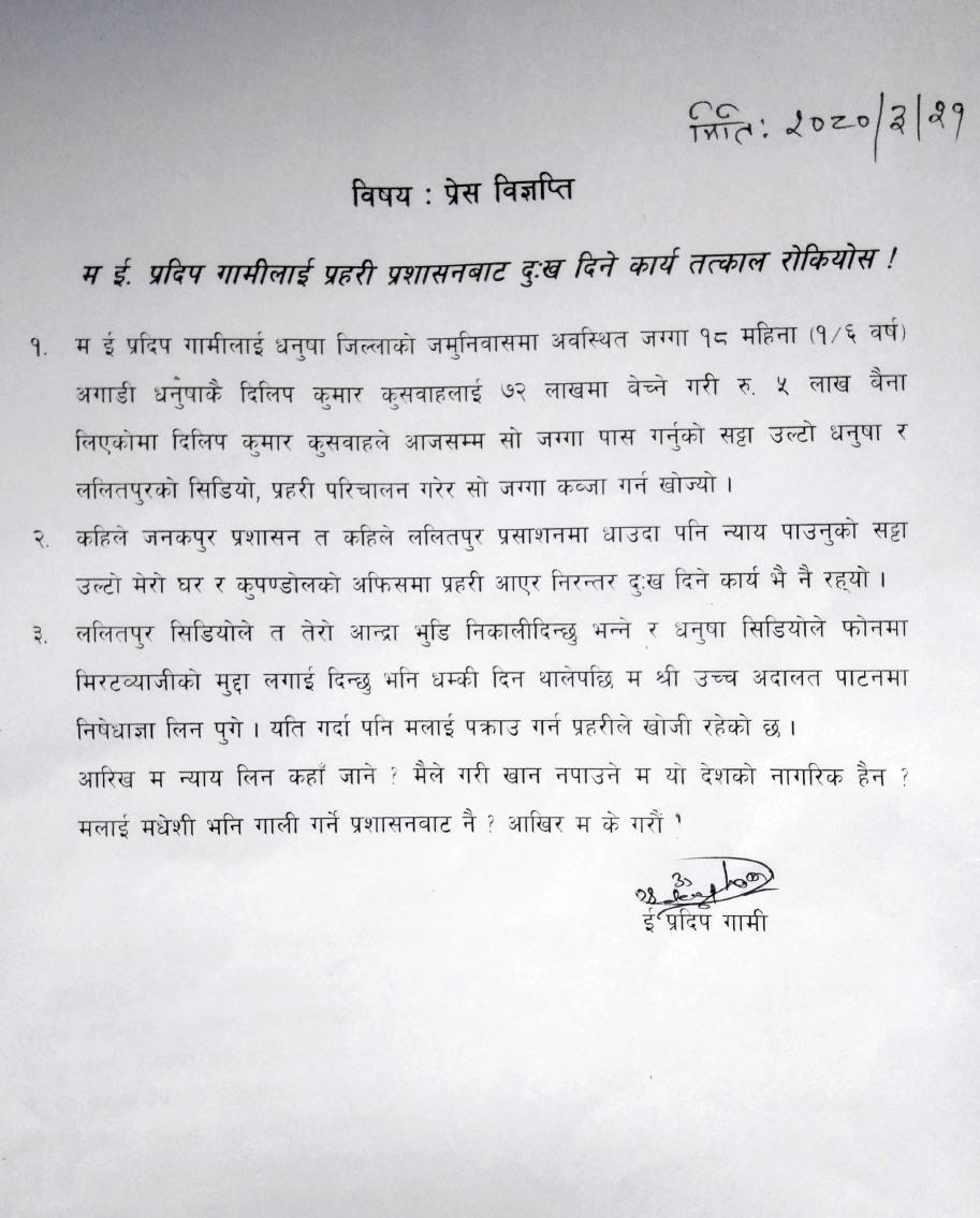 प्रदिपले भने, ‘ललितपुरका सिडिओले त तेरो आन्द्रा भुडि निकालीदिन्छु भने । धनुषाका सिडिओले फोन गरेर मिटरव्याजीको मुद्दा लगाईदिन्छु भनि धम्की दिन थालेपछि म उच्च अदालत पाटनमा निषेधाज्ञा लिन पुगे । यति गर्दापनि मलाई प्रहरीले पक्राउ गर्न खोजिरहेको छ । आखिर म न्याय माग्न कहाँ जाने ? मैले गरी खान नपाउने ? म यो देशको नागरिक हैन ? मलाई मधेशी भनि हेप्दै गाली गर्ने प्रशासनबाट नै ? अनि मैले के गर्ने ?’