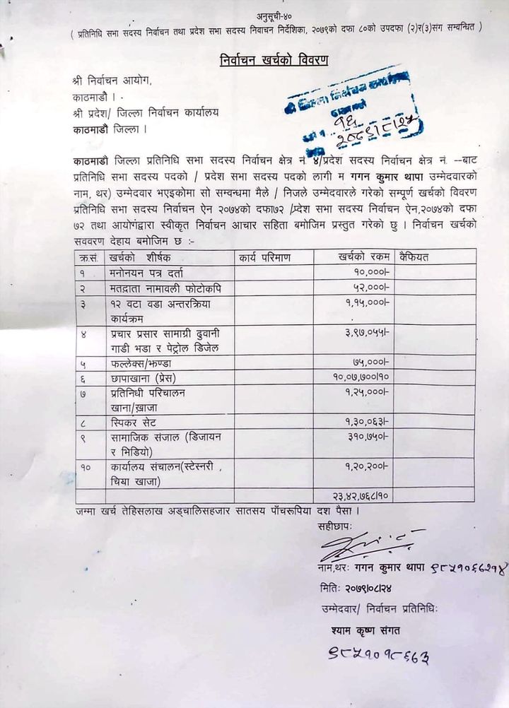 ‘मैले निर्वाचन आयोगमा मिति २०७९।०८।२५ मा आफ्नो खर्च विवरण बुझाइसकेको छु । यो विवरण सार्वजनिक पनि भएको थियो । तर यस्तो जानकारी आयोगलाई गराउनु पर्ने जानकारी नभएको जानकारी गराउँछु। अतः १५ हजार जरिवाना तिरेको जानकारी गराउँदै, पहिला नै आयोगलाई बुझाएर सार्वजनिक भैसकेको निर्वाचन खर्च विवरण पुनः सार्वजनिक गरेको जानकारी गराउँछु’, थापाले सामाजिक सञ्जालमार्फत भनेका छन् ।