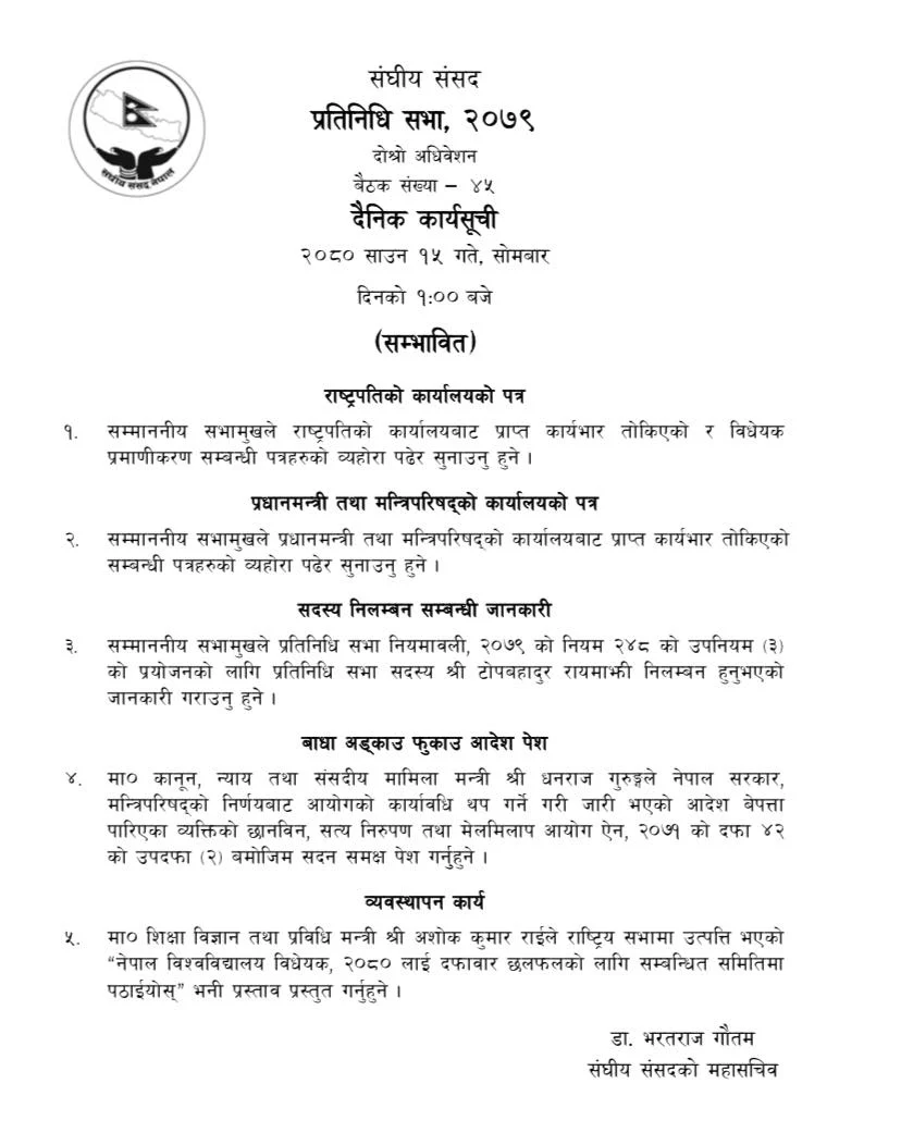 साथै, बेपत्ता पारिएका ब्यक्तिको छानविन आयोग र सत्यनिरुपण मेलमिलाप आयोगको म्याद थप सबन्धि प्रस्ताव पेश गर्ने कार्यक्रम रहेको छ भने राष्ट्रियसभावाट उत्पत्ति भएको नेपाल विश्वबिद्यालय बिद्येयक २०८० लाई समितिमा छलफलका लागि पठाउने प्रस्ताव पेश गर्नेछन् ।