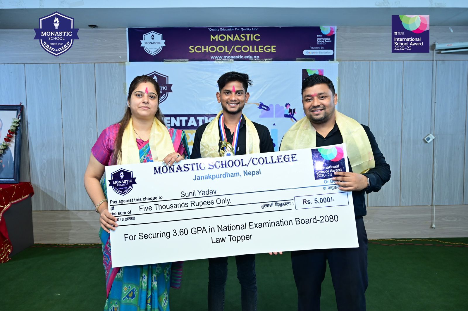 विद्यालयले आइतबार एक कार्यक्रमका बीच ती विद्यार्थीहरूलाई सम्मान गरेको छ । विद्यालयका निर्देशक डा. सोनुले प्रदेशमै प्रथम स्थान ल्याएका सुमित साहलाई नगद ११ हजारसहित सम्मानपत्र र मेडल, श्रुति यादवलाई नगद ८ हजारसहित सम्मानपत्र र मेडल तथा सुनिल यादवलाई नगद ५ हजारसहित सम्मानपत्र र मेडल हस्तान्तरण गरेका हुन् ।