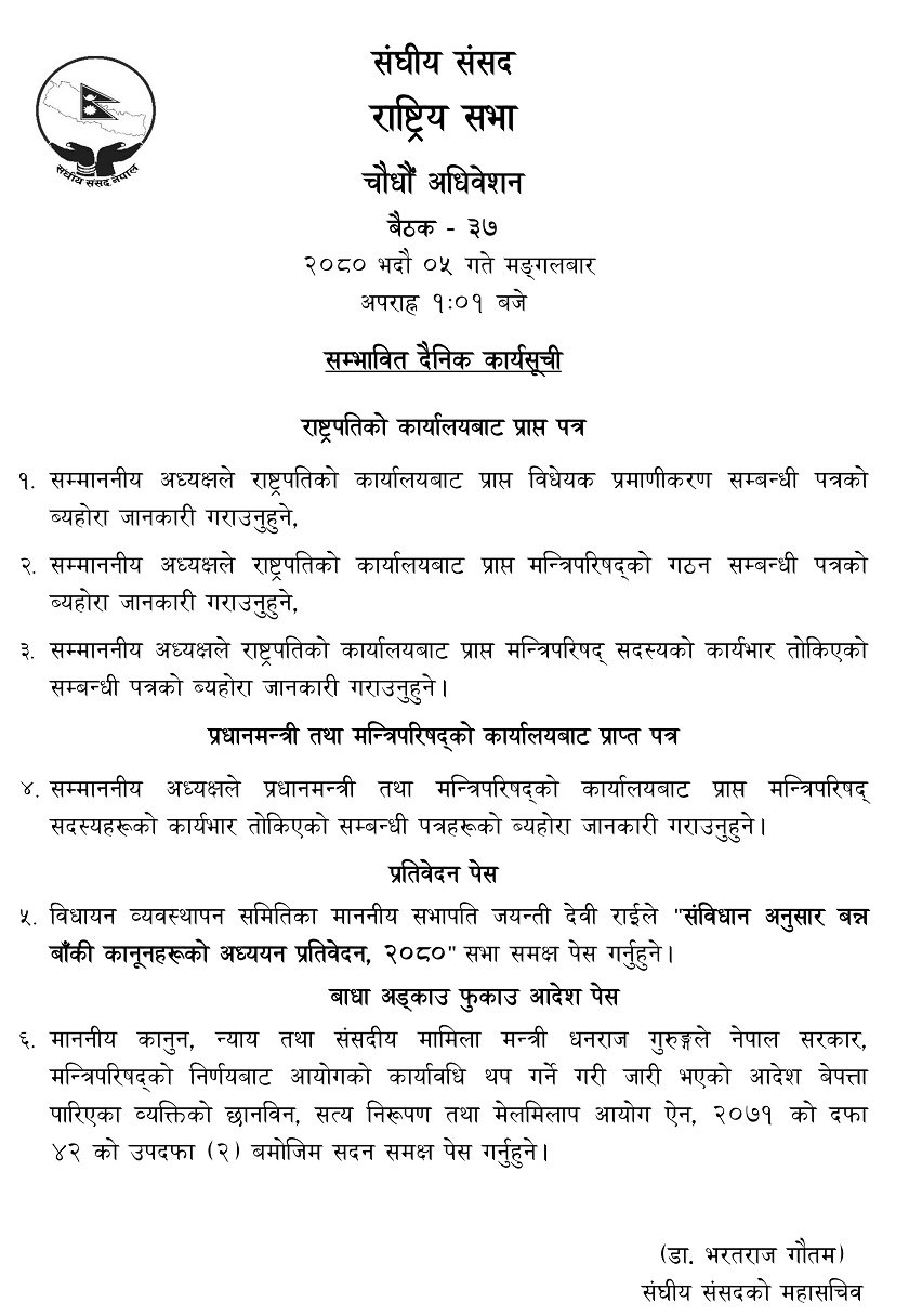 त्यस्तै राष्ट्रियसभा अध्यक्षले प्रधानमन्त्री तथा मन्त्रिपरिषद्को कार्यालयबाट प्राप्त मन्त्रिपरिषद् सदस्यहरूको कार्यभार तोकिएको सम्बन्धी पत्रहरूको ब्यहोरा जानकारी गराउने कार्यसूची रहेको छ । बैठकमा विधायन व्यवस्थापन समितिका सभापति जयन्ती देवी राईले ‘संविधानअनुसार बन्न बाँकी कानुनहरूको अध्ययन प्रतिवेदन, २०८०’ सभा समक्ष पेस गर्ने कार्यसूचीमा समावेश छ ।
