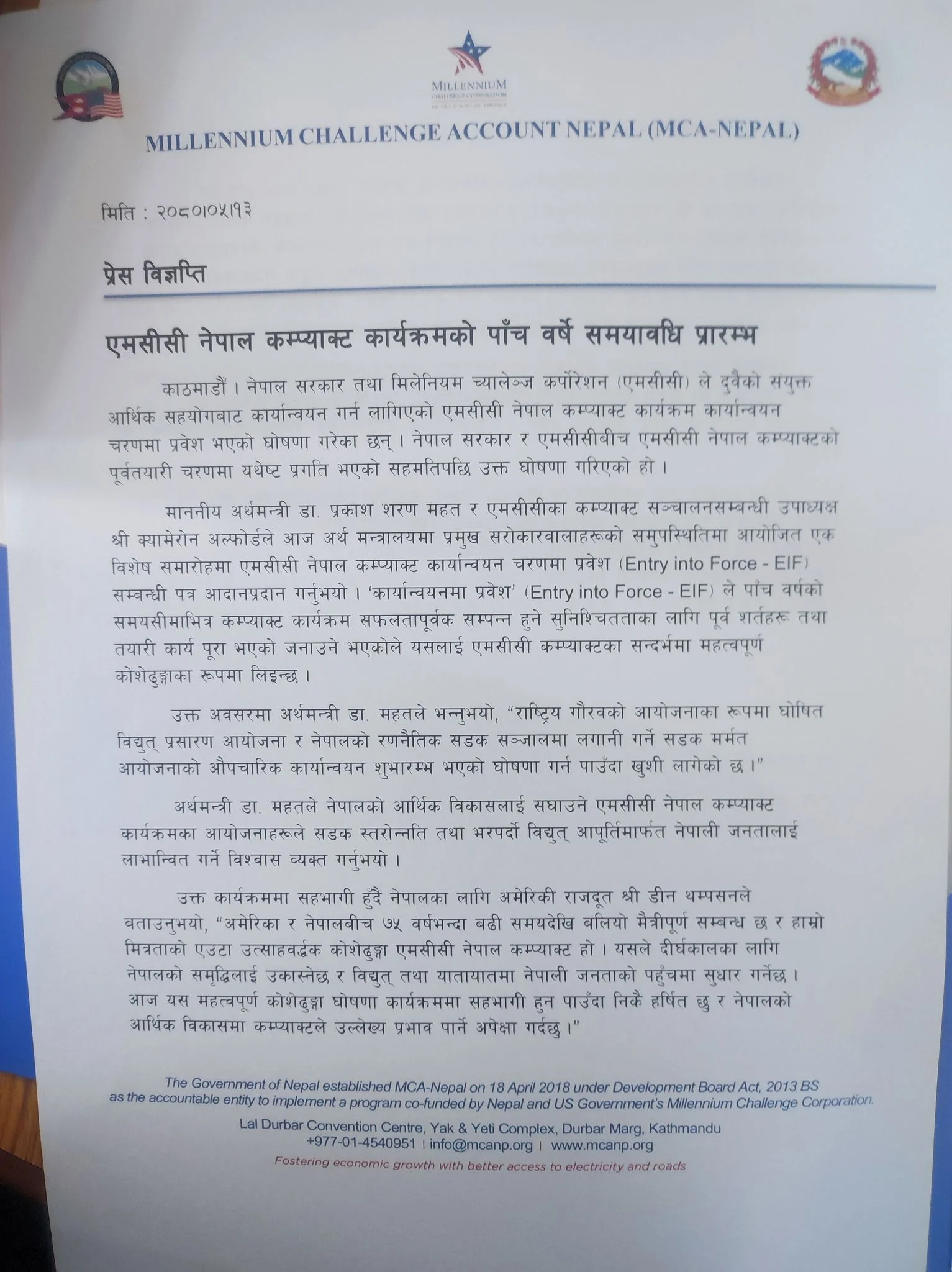 अर्थमन्त्री डा. प्रकाशशरण महत र एमसीसीका कम्प्याक्ट सञ्चालन सम्बन्धी उपाध्यक्ष क्यामेरोन अल्फोर्डले बुधबार अर्थ मन्त्रालयमा प्रमुख सरोकारवालाहरूको उपस्थितिमा एमसीसी नेपाल कम्प्याक्ट कार्यान्वयन चरणमा प्रवेश (इन्ट्री इन्टु फोर्स–ईआईएफ) सम्बन्धी पत्र आदानप्रदान भएको छ । यससँगै पाँच वर्षको समय तोकिएको एमसीसीका परियोजना कार्यान्वयनमा गएको छ ।