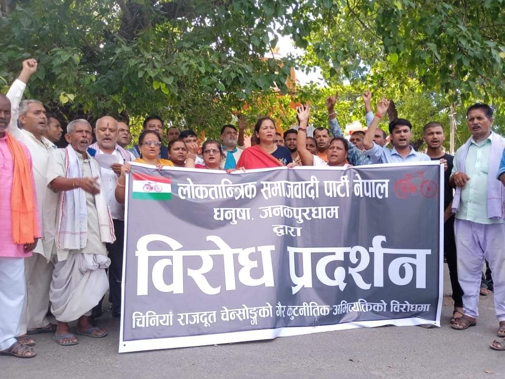 जनकपुरधाम, २२ भदौ । चिनिया राजदुत चेन सोङ्गले गैर कुटनैतिक अभिव्यक्ति दिएको भन्दै लोकतान्त्रिक समाजवादी पार्टी नेपालले जनकपुरधाममा विरोध प्रदर्शन गरेको छ ।