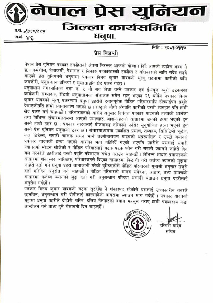 विज्ञप्तीमा लेखिएको छ, ‘पत्रकार विनय कुमार यादवको मृत्यु प्रकरणमा धनुषा प्रहरीले दवावपूर्वक पीडित परिवारमाथि होच्याईपन प्रवृति देखाएकोप्रति हाम्रो ध्यानाकर्षण भएको छ । राष्ट्रको चौथो अंगप्रति प्रहरीको यस्तो व्यवहारप्रति हामी खेद प्रकट गर्न चाहन्छौं ।’