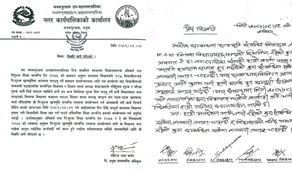 सो निःशुल्क छात्रवृति सम्बन्धि व्यवस्था कार्यान्वयन गर्न आनाकानी गरेर वार्ता निष्कर्षविहिन भएको सम्बन्धमा आइतवारदेखि सम्पुर्ण संस्थागत विद्यालय सुचारु गरी विद्यार्थीको शिक्षा प्राप्त गर्न पाउने संवैधानिक शिक्षा सम्बन्धि हकको कार्यान्वयन गर्न उपमहानगरले अनुरोध गरेको छ ।