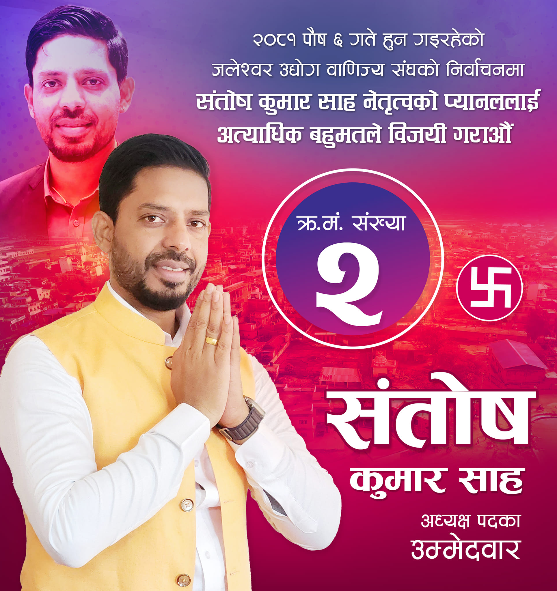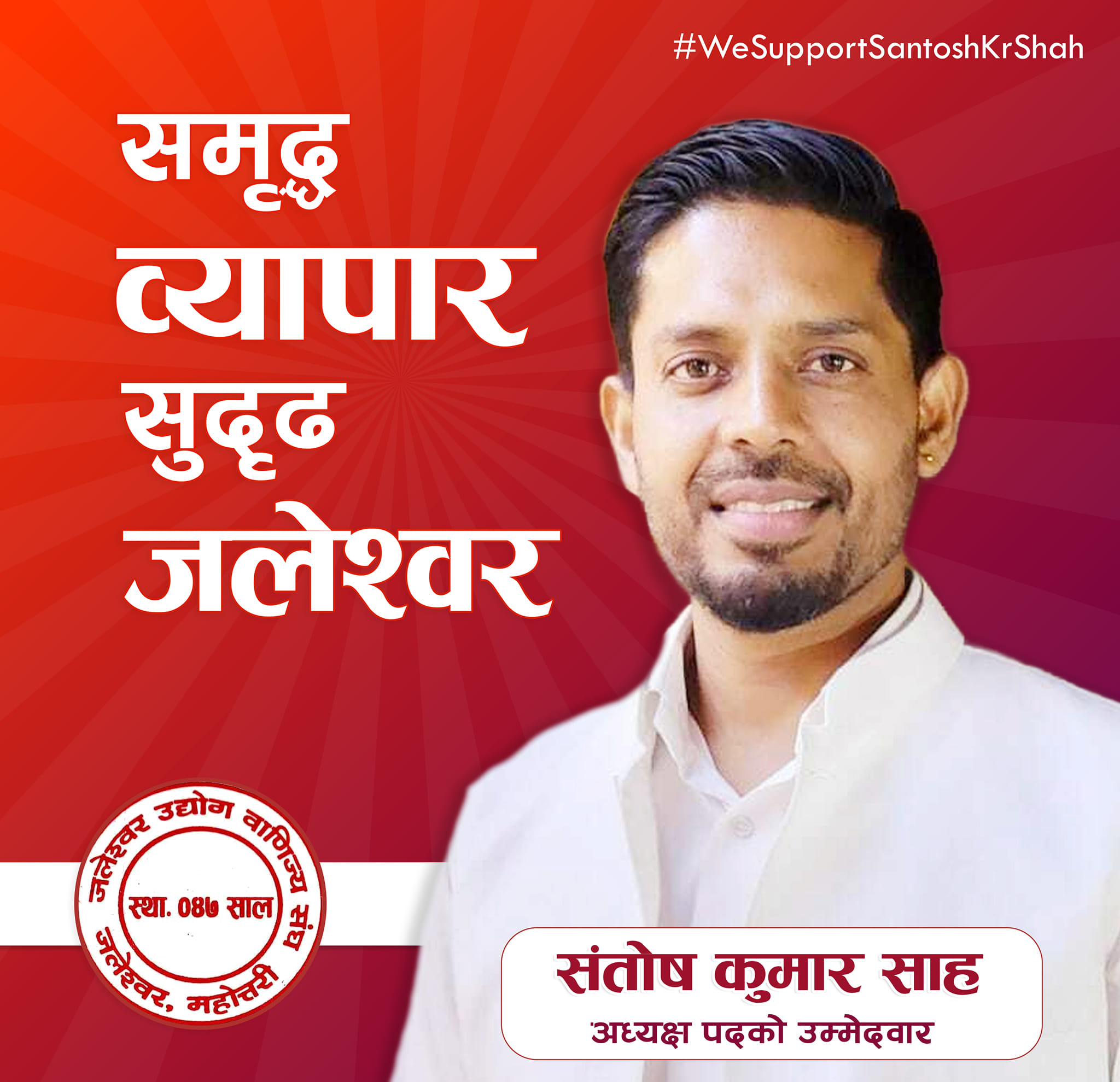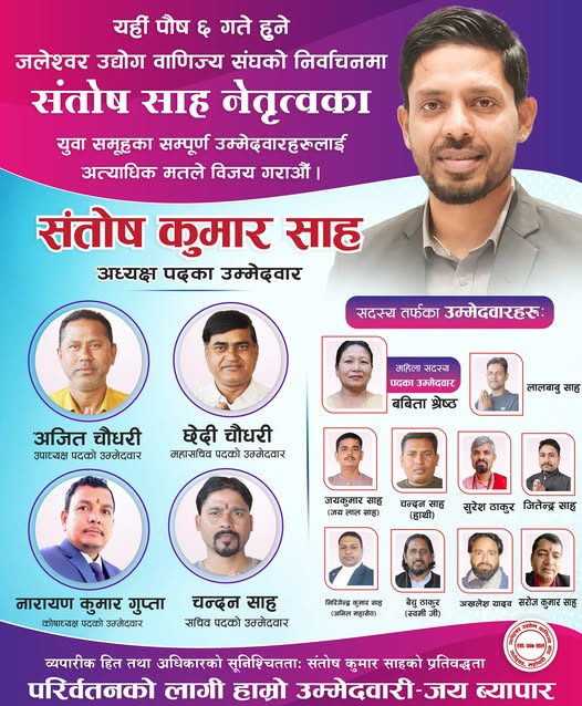 व्यापारीका समस्या समाधान गर्न, संस्थालाई सबल बनाउन र जलेश्वरको व्यापारलाई नयाँ उचाइमा पुर्याउन आफ्नो उम्मेदवारी सबैको साथ र विश्वासको प्रतीक रहेको संतोषको भनाइ छ ।