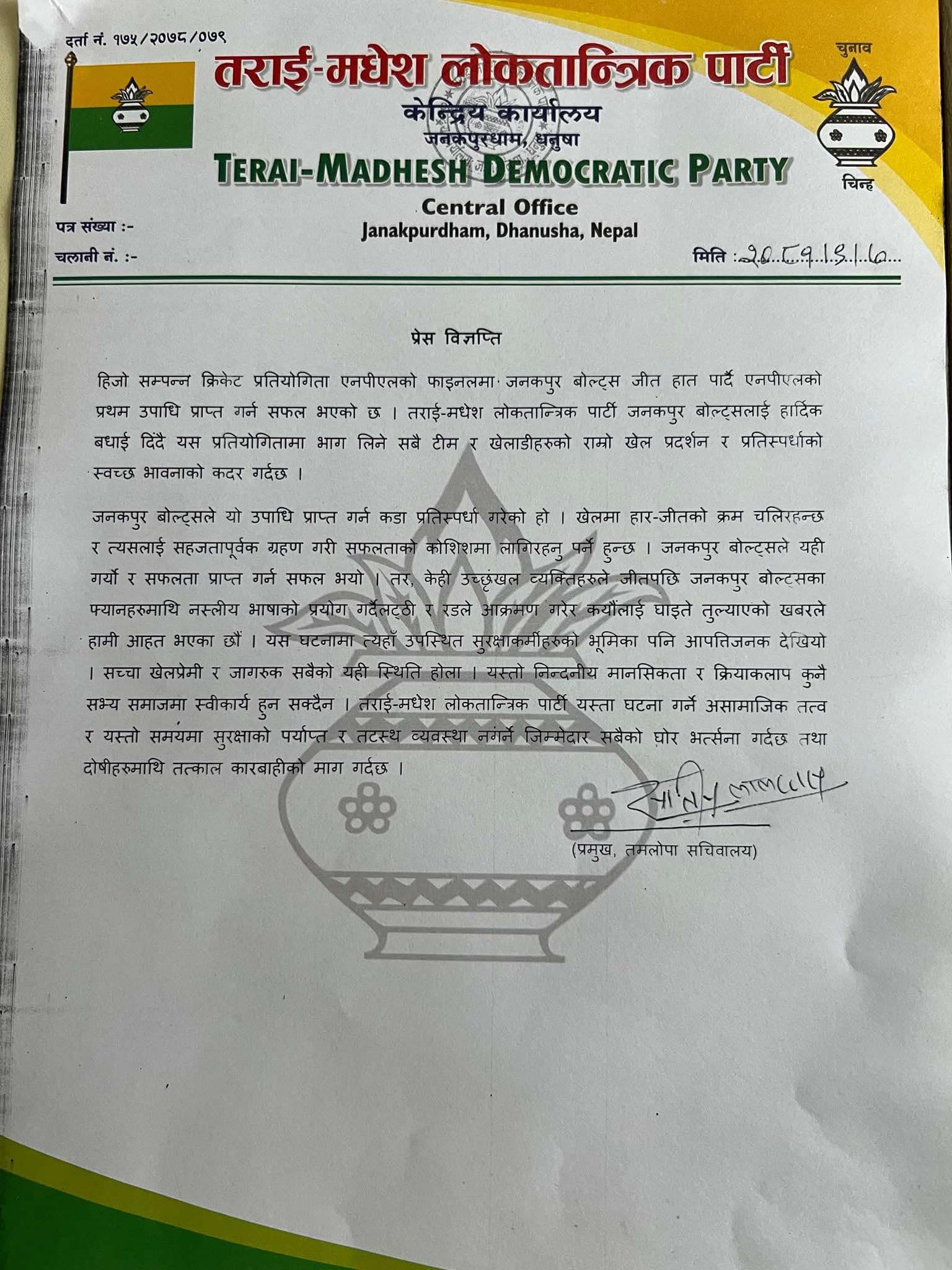 तमलोपाको विज्ञप्तिमा आगाडि उल्लेख छ, “जनकपुर बोल्ट्सले यो उपाधि प्राप्त गर्न कडा प्रतिस्पर्धा गरेको हो । खेलमा हार–जीतको क्रम चलिरहन्छ र त्यसलाई सहजतापूर्वक ग्रहण गरी सफलताको कोशिशमा लागिरहनु पर्ने हुन्छ । जनकपुर बोल्ट्सले यही गर्यो र सफलता प्राप्त गर्न सफल भयो । तर, केही उच्छृंखल व्यक्तिहरुले जीतपछि जनकपुर बोल्ट्सका फ्यानहरुमाथि नस्लीय भाषाको प्रयोग गर्दै लट्ठी र रडले आक्रमण गरेर कयौंलाई घाइते तुल्याएको खबरले हामी आहत भएका छौं । यस घटनामा त्यहाँ उपस्थित सुरक्षाकर्मीहरुको भूमिका पनि आपत्तिजनक देखियो । सच्चा खेलप्रेमी र जागरुक सबैको यही स्थिति होला । यस्तो निन्दनीय मानसिकता र क्रियाकलाप कुनै सभ्य समाजमा स्वीकार्य हुन सक्दैन । तराई–मधेश लोकतान्त्रिक पार्टी यस्ता घटना गर्ने असामाजिक तत्व र यस्तो समयमा सुरक्षाको पर्याप्त र तटस्थ व्यवस्था नगर्ने जिम्मेदार सबैको घोर भर्त्सना गर्दछ तथा दोषीहरुमाथि तत्काल कारबाहीको माग गर्दछ ।”