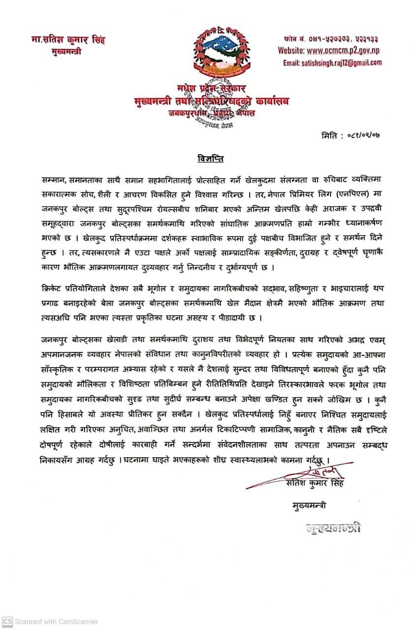 मधेश प्रदेशका मुख्यमन्त्री सतिश कुमार सिंहले आइतबार एक विज्ञप्ति जारी गर्दै शनिबार काठमाडौंमा जनकपुर बोल्ट्सका समर्थकमाथि गरिएको सांघातिक आक्रमणप्रति प्रेश सरकारको गम्भीर ध्यानाकर्षण भएको बताएका हुन् ।
