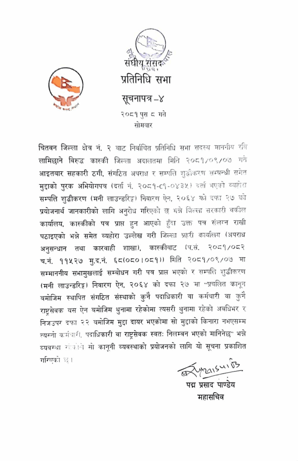 लामिछानेविरुद्ध सहकारी ठगी, संगठित अपराधसहित सम्पत्ति शुद्धीकरणमा पनि कास्की जिल्ला अदालतमा अभियोगपत्र दर्ता भएको जानकारीपत्र प्रहरीले सभामुख देवराज घिमिरेलाई आइतबार साँझनै पत्र पठाएको थियो ।