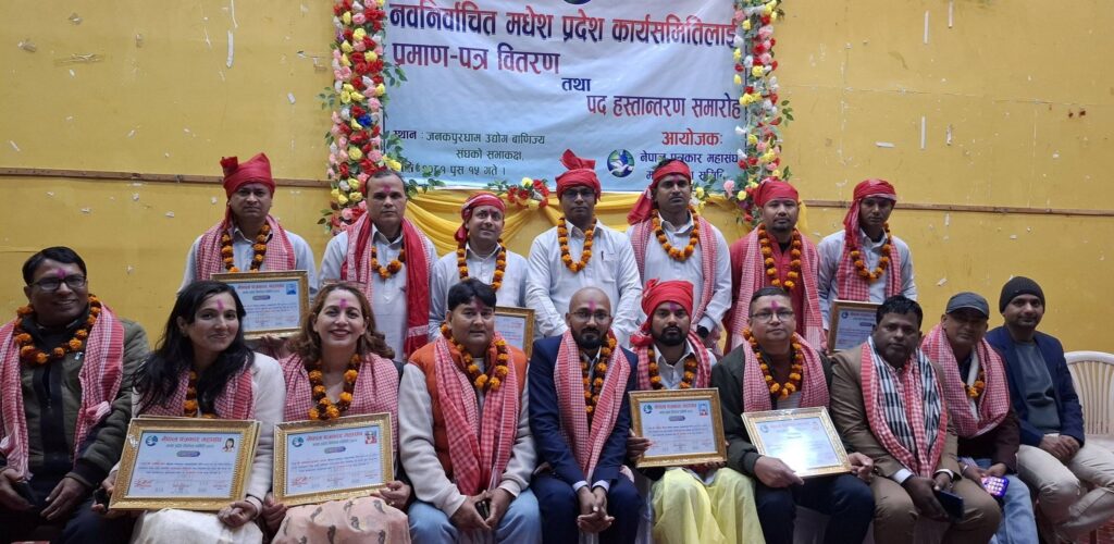 जनकपुरधाम, १५ पुष । नेपाल पत्रकार महासंघ मधेश प्रदेश समितिको नवनिर्वाचित कार्यसमितिलाई प्रमाणपत्र वितरण तथा पद हस्तान्तरण कार्यक्रम आज जनकपुरधाममा सम्पन्न भएको छ । निवर्तमान बनेको कार्यसमितिले नयाँ कार्यसमितिलाई पद हस्तान्तरण गरेको हो ।