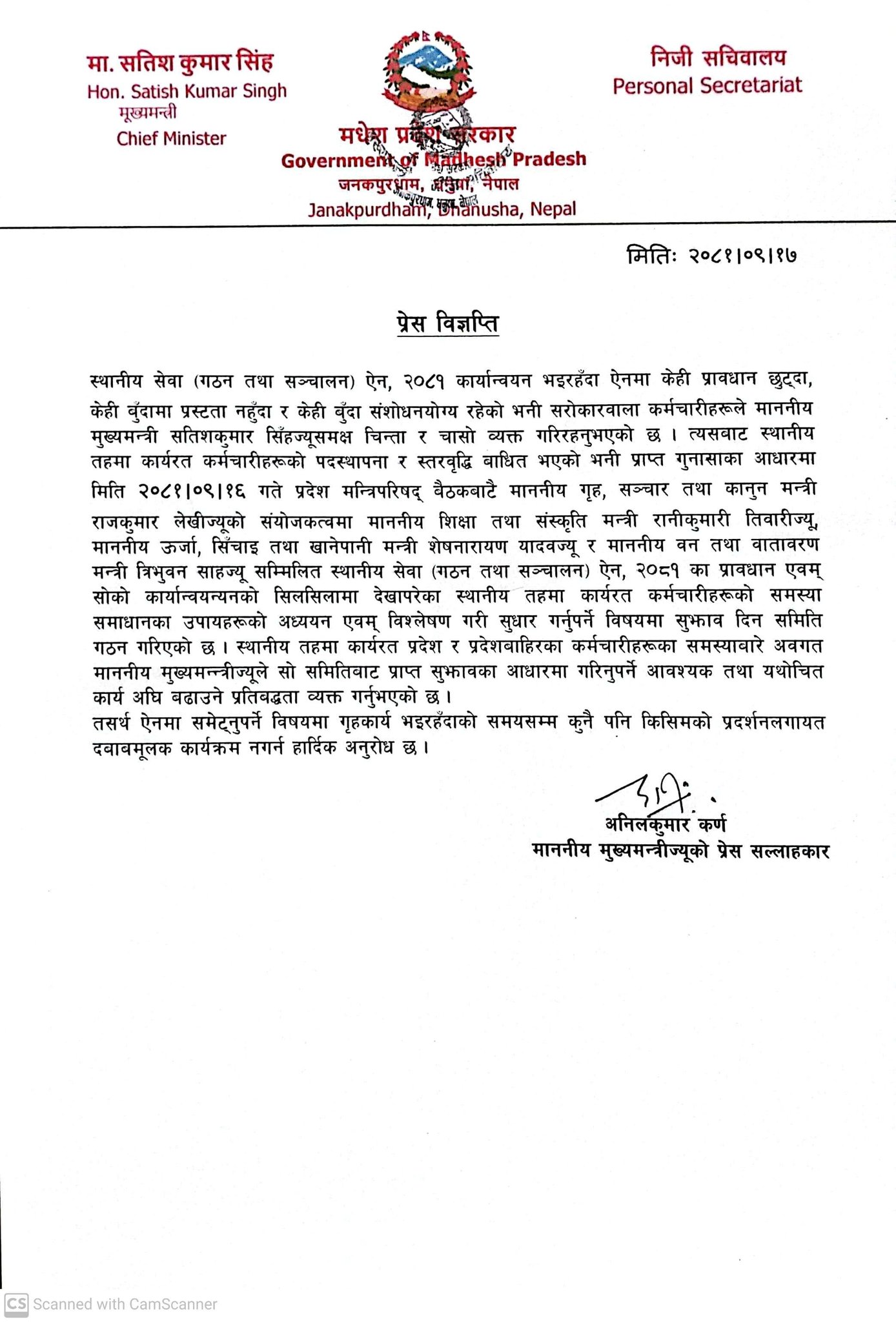 स्थानीय तहमा कार्यरत कर्मचारीहरूको पदस्थापना र स्तरवृद्धि बाधित भएको गुनासाका आधारमा पुष १६ गते बसेको प्रदेश मन्त्रिपरिषद् बैठकबाटै गृह, सञ्चार तथा कानुन लेखीको संयोजकत्वमा शिक्षा तथा संस्कृति मन्त्री रानीकुमारी तिवारी, ऊर्जा, सिंचाइ तथा खानेपानी मन्त्री शेषनारायण यादव र वन तथा वातावरण मन्त्री त्रिभुवन साह सम्मिलित सुझाव समिति गठन गरिएको छ ।