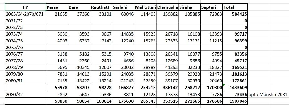 त्यस्तै, चालू आर्थिक वर्ष २०८१/०८२ को ५ महिना (साउन देखि मंसिर)सम्ममा पर्साबाट २ हजार ८५२, बाराबाट ५ हजार ६४७, रौतहटबाट ५ हजार ३८६, सर्लाहीबाट ८ हजार ८११, महोत्तरीबाट १२ हजार १२८, धनुषाबाट १७ हजार ३७३, सिरहाबाट १३ हजार ४५३ र सप्तरीबाट ७ हजार ७८६ सहित जम्मा ७३ हजार ४३६ जना वैदेशिक रोजगारीका लागि पलायन भएका छन् ।