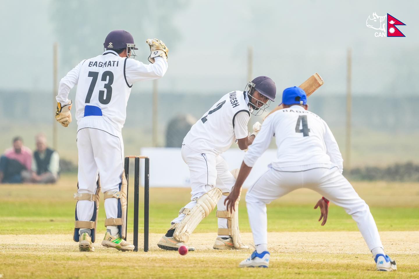 तेस्रो नम्बरका ब्याट्सम्यान निरज यादवले १२ रन बनाए । उनले ३५ बलमा एक चौका प्रहार गरे । चौथो नम्बरमा क्रिज सम्हाल्न आएका साहिल पटेल ६ रनमै आउट भए । विकेटकिपर ब्याट्सम्यान हिमांशु दत्त पनि १० रनभन्दा अगाडि बढ्न सकेनन् ।