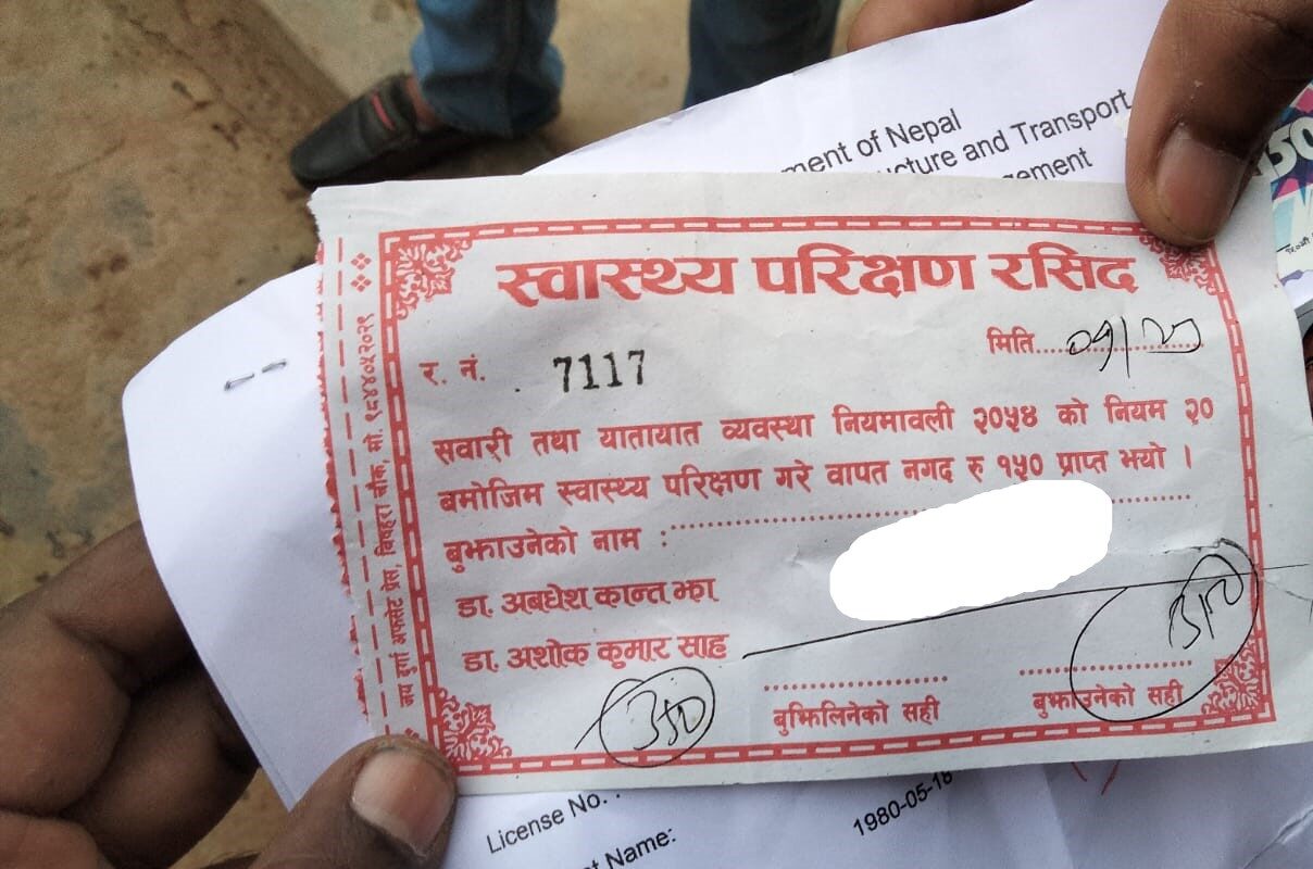 यातायात व्यवस्था कार्यालय जनकपुरधामले उपलब्ध गराउने स्वास्थ्य परिक्षण रसिदमा सवारी तथा यातायात व्यवस्था नियमावली २०५४ को नियम २० बमोजिम स्वास्थ्य परिक्षण गरे वापत नगद रु. १५० प्राप्त भयो भन्दै लेखिएको छ । त्यसमा दुईजना चिकित्सक डा. अवधेश कान्त झा र डा. अशोक कुमार साहको नामसमेत लेखिएको छ । तर, रसिदमा न त बुझाउनेको न त बुझिलिनेको हस्ताक्षर छ ।