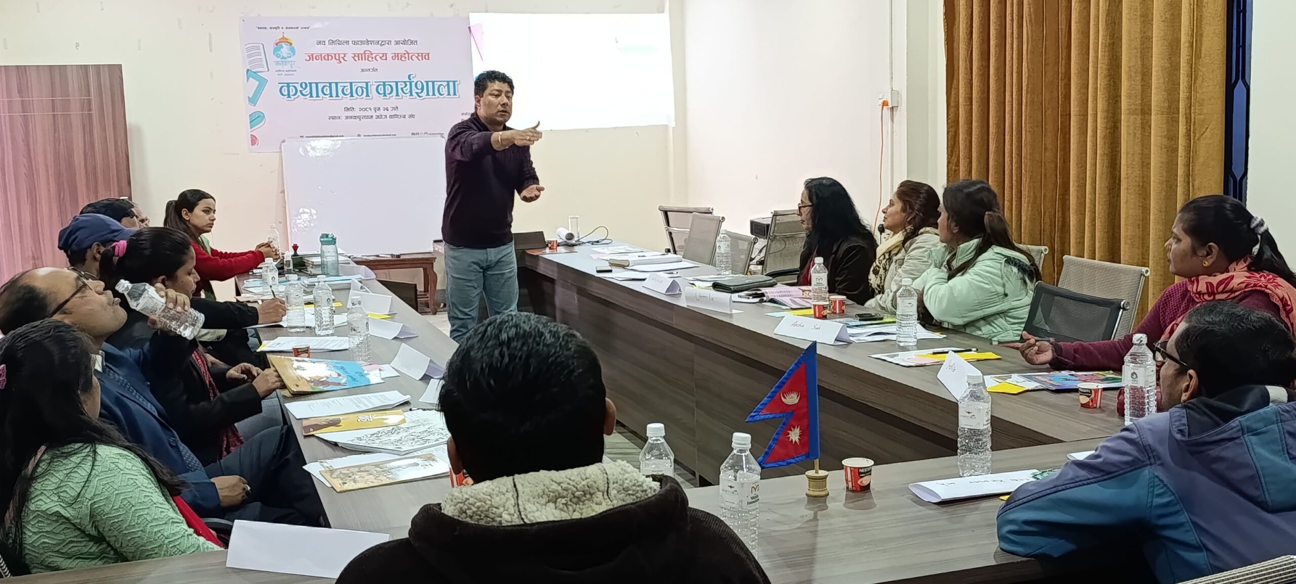 आज आयोजित कार्यशालामा जनकपुरधामका सामुदायिक तथा निजी विद्यालयका शिक्षकहरू सहभागी थिए। उनीहरूले प्रशिक्षण लिएपश्चात् आफ्ना विद्यार्थीहरूलाई कथावाचनका विषयमा प्रशिक्षित गर्नेछन् ।