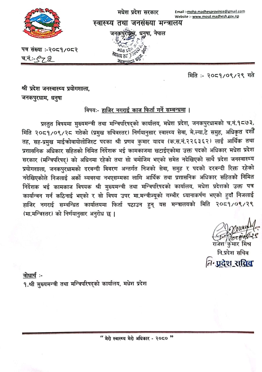 प्रदेश जनस्वास्थ्य प्रयोगशाला, जनकपुरधामको दरवन्दी विवरण अन्तर्गत यादवको सेवा, समुह र पदको दरबन्दी रिक्त नरहेकोले उनलाई अर्को व्यवस्था नभएसम्मका लागि आर्थिक तथा प्रशासनिक अधिकार सहितको निमित्त निर्देशक भई कामकाज विषयक मुख्यमन्त्री कार्यालयको उक्त पत्र कार्यान्वयन गर्न कठिनाई भएको र सो विषय उपर ध्यानाकर्षण भएको हुदाँ उनलाई हाजिर नगराई सम्बन्धित कार्यालयमा फिर्ता पठाउन मन्त्रिस्तरको निर्णयानुसार पत्र काटियो ।
