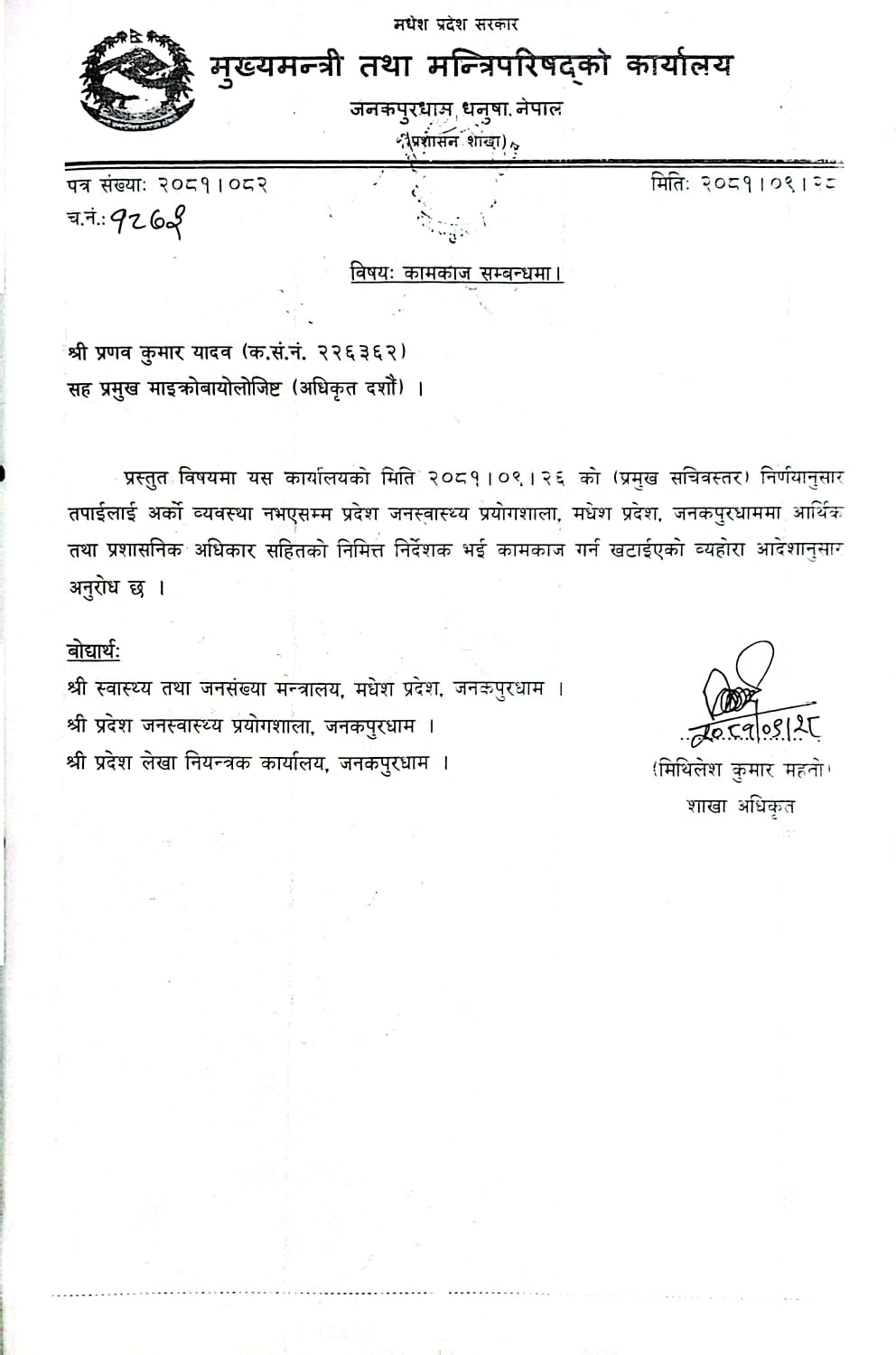 मुख्यमन्त्री तथा मन्त्रिपरिषद्को कार्यालयको पुष २८ गतेको (प्रमुख सचिवस्तर) निर्णयानुसार स्वास्थ्य सेवा, मे.ल्या.टे समुह, अधिकृत दशौं तह, सह–प्रमुख माईक्रोबायोलोजिस्ट पदका यादवलाई आर्थिक तथा प्रशासनिक अधिकार सहितको निमित्त निर्देशक भई कामकाजमा खटाइएकोमा उक्त पदको अधिकार मधेश प्रदेश सरकार (मन्त्रिपरिषद्) को अधिनमा रहेको तथा सो बमोजिम नदेखिएको भन्दै उनलाई काज फिर्ता हुन पत्र काटेको थियो ।