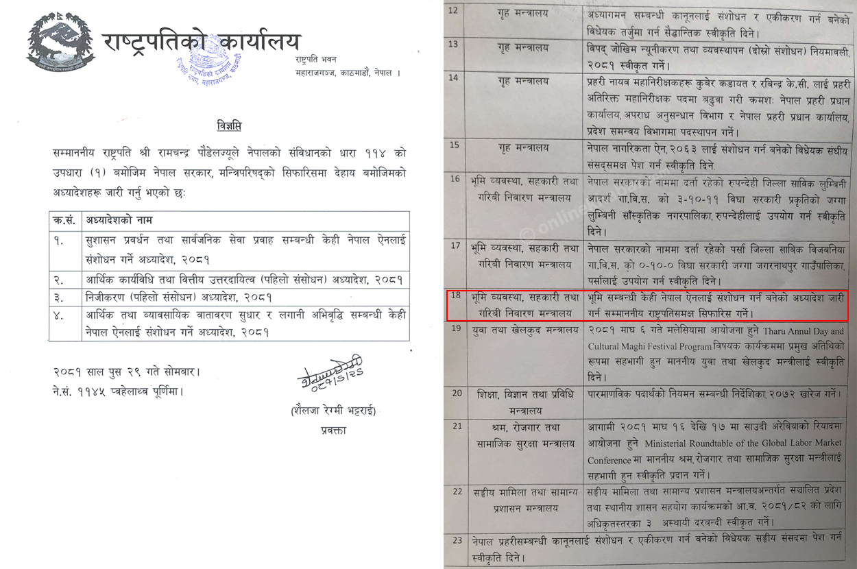 राष्ट्रपति कार्यालयका प्रवक्ता शैलजा रेग्मी भट्टराईका अनुसार भूमि सम्बन्धी अध्यादेश राष्ट्रपति कार्यालयमा अध्ययनकै क्रममा रहेको बताइएको छ । “भूमिसम्बन्धी अध्यादेश जारी भएको छैन । यो अध्यादेश अध्ययनकै क्रममा छ,“ रेग्मीले जानकारी दिए ।