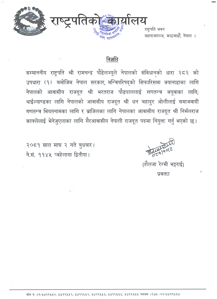 नेपालको संविधानको धारा २८२ को उपधारा १ बमोजिम राष्ट्रपति पौडेलले भरतराज पौडेललाई गणतन्त्र क्यूवा, धनबहादुर ओलीलाई भियतनाम र निर्मल राज काफ्लेलाई भेनेजुएलाको गैरआवासीय राजदूतमा नियुक्त गरेको राष्ट्रपति कार्यालयले जानकारी दिएको छ ।