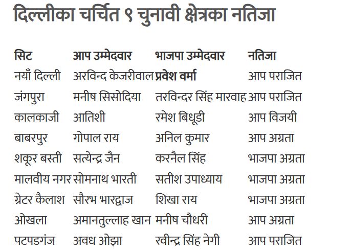 भाजपाले यस पटकको चुनावमा ४८ सिट जितेर नयाँ इतिहास कायम गरेको छ । सन् २०२० मा मात्र ८ सिट जित्न सफल भएको भाजपाले यस पटक ६ गुणा बढी सिट जित्न सफल भएको छ । भाजपा नेता प्रवेश वर्माले आम आदमी पार्टीका प्रमुख नेता अरविन्द केजरीवाललाई ३ हजार मतले पराजित गर्दै नयाँ दिल्ली निर्वाचन क्षेत्रमा जित हासिल गरेका छन् ।