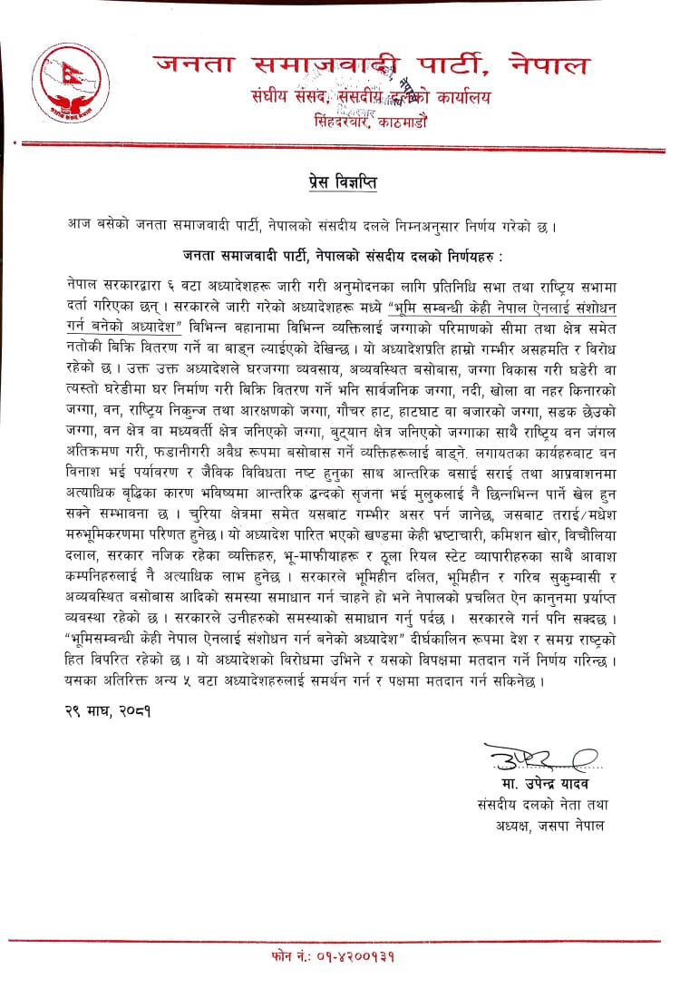 तर, जसपाले भूमि सम्बन्धी अध्यादेशलाई अस्वीकार गरे पनि बाँकी पाँच अध्यादेशको पक्षमा भने सहयोग गर्ने निर्णय गरेको छ ।