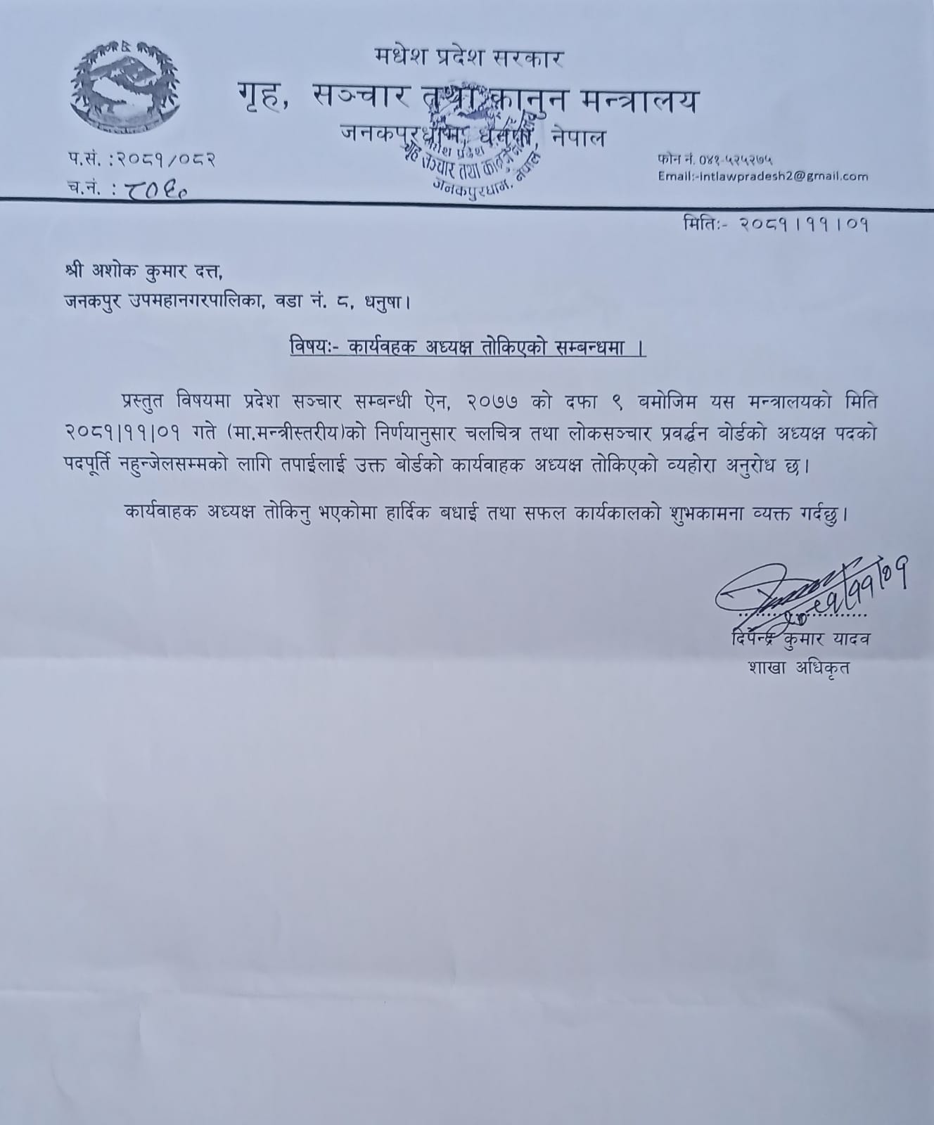 जनकपुरधाम, २ फागुन । मधेश प्रदेश सरकारको गृह, सञ्चार तथा कानुन मन्त्रालयअन्तर्गतको चलचित्र तथा लोकसञ्चार प्रवर्द्धन बोर्डको कार्यवाहक अध्यक्षको पदमा प्रसिद्ध साहित्यकार र गीतकार अशोक कुमार दत्तलाई नियुक्त गरिएको छ ।