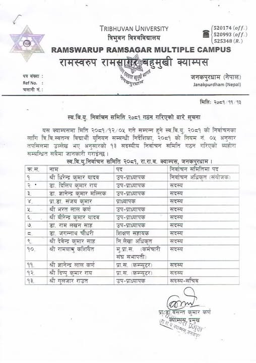 जनकपुरधाम, १३ फागुन । जनकपुरधामस्थित रामस्वरुप रामसागर बहुमुखी (राराब) क्याम्पसमा आगामी चैत १२ गते हुन लागेको स्वतन्त्र विद्यार्थी युनियनको चुनावको तयारी सुरु भएको छ । क्याम्पस प्रशासनले चुनावको लागि १३ सदस्यीय निर्वाचन समिति गठन गरेको छ ।