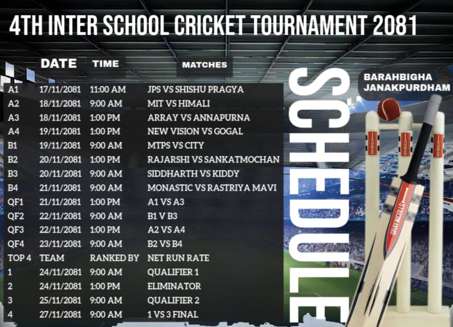 जनकपुरधाममा चौथो अन्तर स्कुल क्रिकेट प्रतियोगिता सुरु, १६ टोलीको सहभागिता