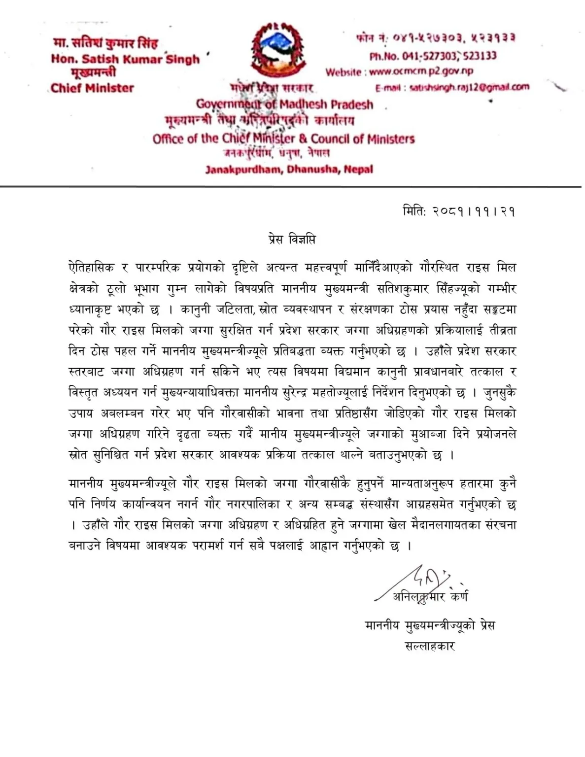 बुधबार मुख्यमन्त्री सिंहका प्रेस सल्लाहकार अनिलकुमार कर्णले जारी गरेको प्रेस विज्ञप्तिमा गौर राइस मिल क्षेत्रको भूभाग गुम्न नदिन प्रदेश सरकार गम्भीर र दृढ रहेको उल्लेख गरिएको छ ।