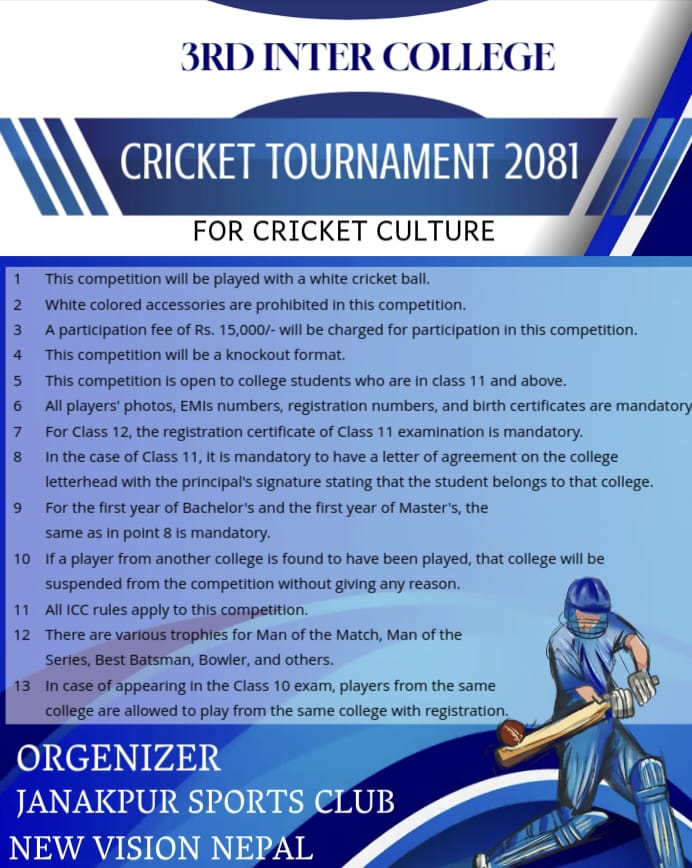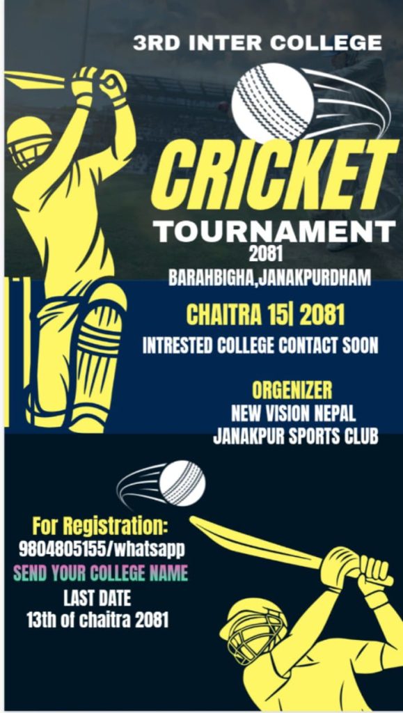 जनकपुरधाम, ४ चैत । जनकपुरधाममा आगामी चैत १५ गतेदेखि तेस्रो इन्टर कलेज क्रिकेट प्रतियोगिता सुरु हुने भएको छ । यो प्रतियोगिता रंगभुमी मैदान बार्हबिघामा आयोजना हुँदैछ ।