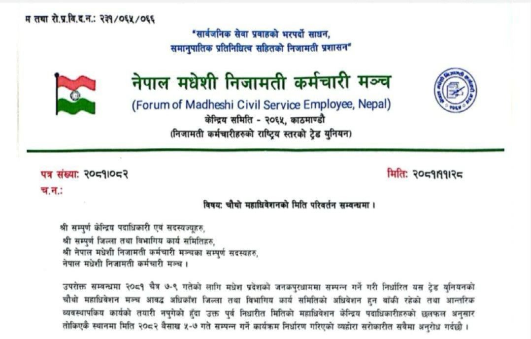 नेपाल मधेशी निजामती कर्मचारी मञ्चको चौथो महाधिवेशन वैशाख ५–७ मा तय