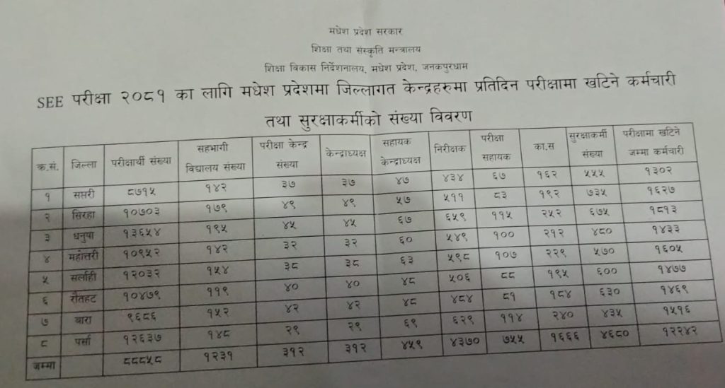 प्रदेशभरका विभिन्न जिलामा परीक्षार्थीहरूको संख्या र परीक्षा केन्द्रहरूको व्यवस्थापन यस प्रकार रहेको छ :