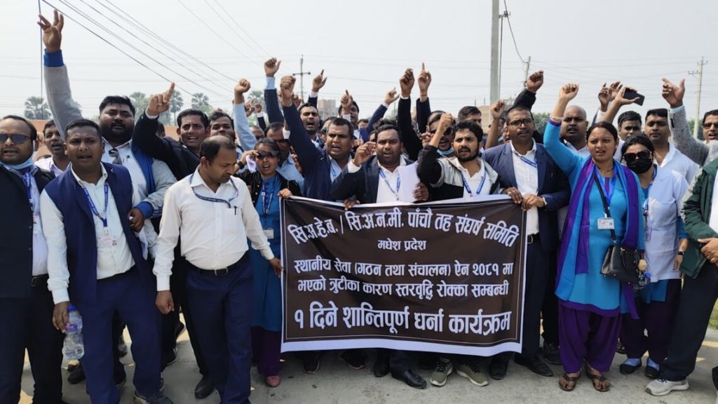 जनकपुरधाम, ८ चैत । मधेश प्रदेशमा कार्यरत सिनियर अहेब र अनमीहरूले स्थानीय सेवा ऐन २०८१ का त्रुटिहरूका कारण आफ्नो स्तरवृद्धि रोकिएको भन्दै विरोध प्रदर्शन गरेका छन् । संघीय स्वास्थ्य सेवा ऐन २०५३ मा उल्लेखित तहवृद्धिको सामान्य सिद्धान्तलाई स्थानीय सेवा ऐनले तोडेको उनीहरूको आरोप छ ।