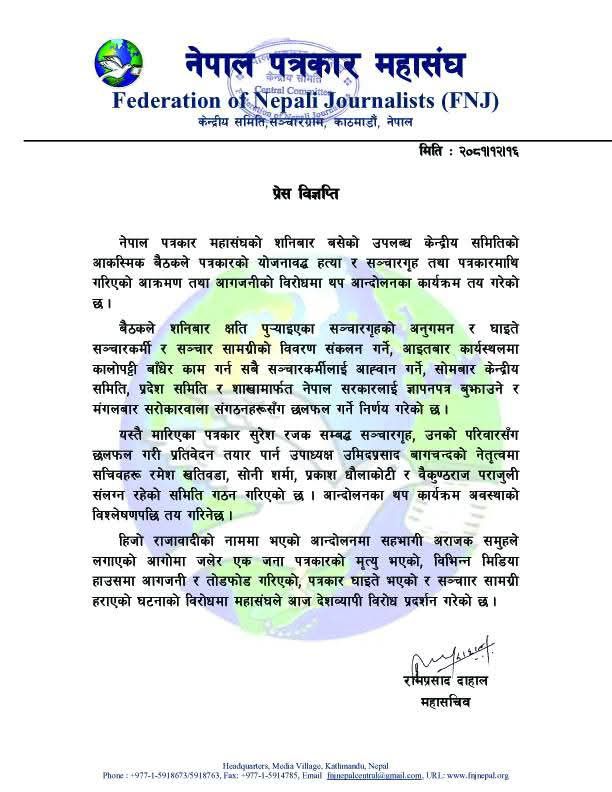 काठमाडौं, १६ चैत । नेपाल पत्रकार महासंघको शनिबार बसेको आकस्मिक केन्द्रीय समितिको बैठकले पत्रकार सुरेश रजकको योजनाबद्ध हत्या र सञ्चारगृह तथा पत्रकारमाथि भएको आक्रमण तथा आगजनीको विरोधमा देशव्यापी आन्दोलनका थप कार्यक्रम घोषणा गरेको छ ।