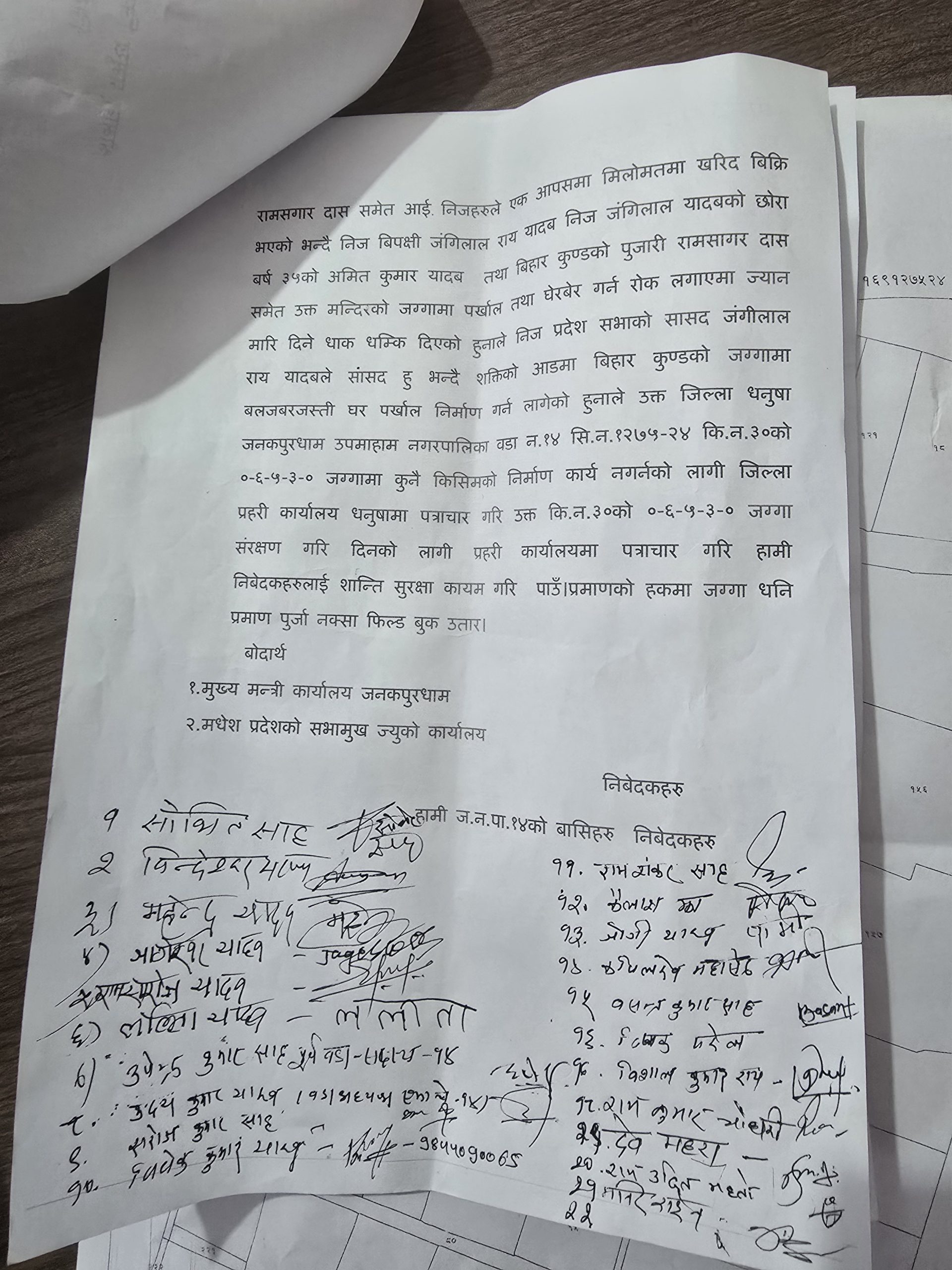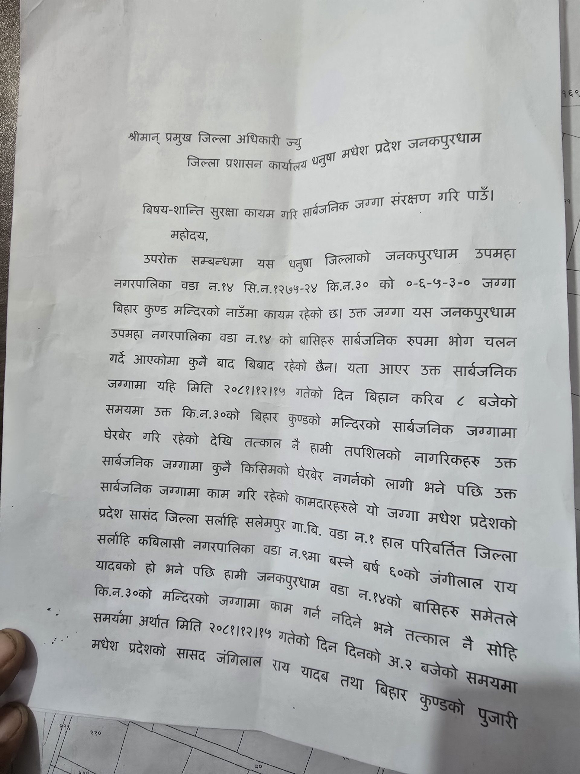 जनकपुरधाम–१४ का स्थानीय युवा उदय कुमार यादवको नेतृत्वमा सोभित साह, विन्देश्वर यादव, महेन्द्र यादव, जागेश्वर यादव, राम सरोज यादव, ललिता यादव, जनकपुरधाम–१४ का पूर्व वडासदस्य उपेन्द्र कुमार साह, सरोज कुमार साह, विवेक कुमार यादव, राम शंकर साह, कैलाश झा, जोगी यादव, कपिलदेव महासेठ, बसन्त कुमार साह, दिपक पटेल, विशाल कुमार राय, राम कुमार चौधरी, देव महरा, राम उदित महतो,मनिर राइनलगायतका व्यक्तिहरुले प्रमुख जिल्ला अधिकारी कडरियालाई संयूक्त ध्यानाकर्षण पत्र बुझाएका हुन् ।