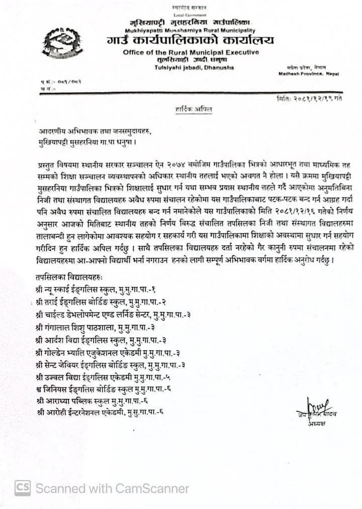 जनकपुरधाम, १९ चैत । धनुषाको मुखियापट्टी मुसहरनिया गाउँपालिकामा स्थानीय तहको अनुमतिबिना अवैध रूपमा सञ्चालन भइरहेका निजी तथा संस्थागत विद्यालयहरूमा गाउँपालिकाले कडा कदम चालेको छ ।