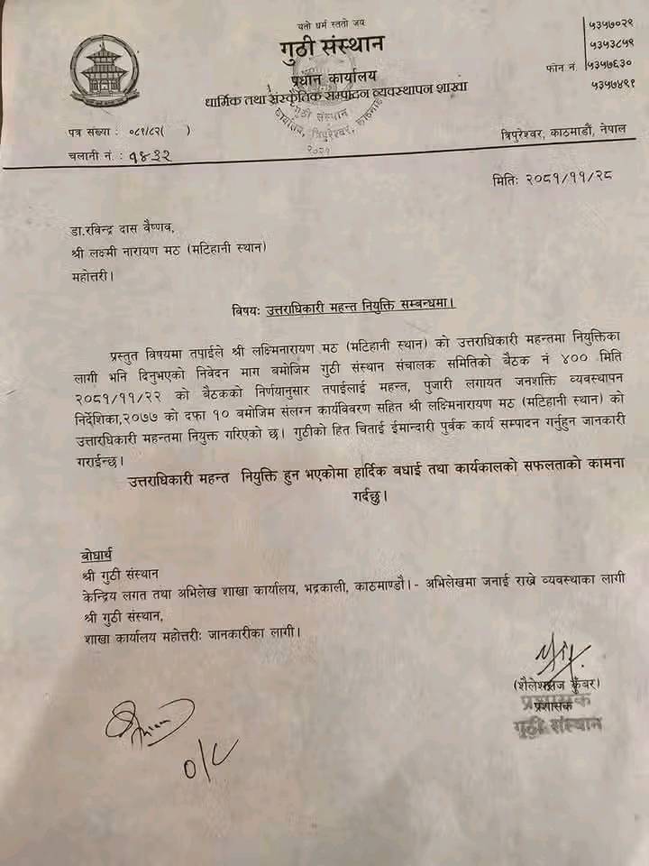 गुठी संस्थानले फागुन २८ गते जारी गरेको पत्रका अनुसार मठिहानी स्थानको उत्तराधिकारी नियुक्तिका लागि परेको निवेदनको आधारमा समितिको बैठक नं ४ सयको निर्णयअनुसार डा. दासलाई निर्देशिका २०७७ को दफा १० बमोजिम महन्थको पदमा नियुक्ति प्रदान गरिएको हो ।