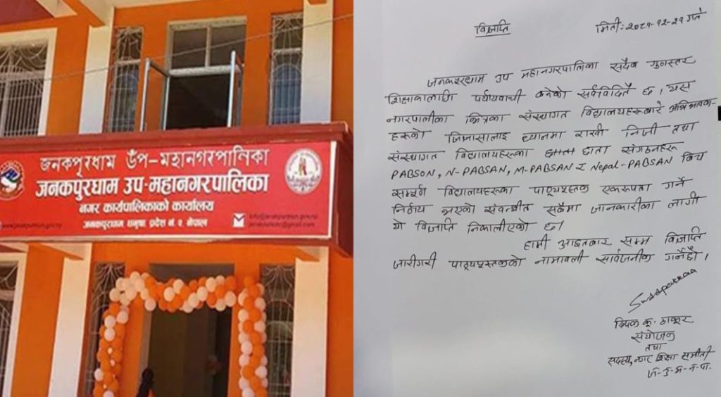 जनकपुरधाम, २१ चैत । जनकपुरधाम उपमहानगरपालिकाले नगरका सम्पूर्ण विद्यालयका पाठ्यपुस्तकमा एकरूपता ल्याउने निर्णय गरेको छ । नगर शिक्षा समिति तथा निजी विद्यालय संगठन (प्यावसन) का नगर संयोजक दीपक ठाकुरले बिहीबार एक विज्ञप्ति जारी गर्दै निर्णयबारे जानकारी दिएका छन् ।