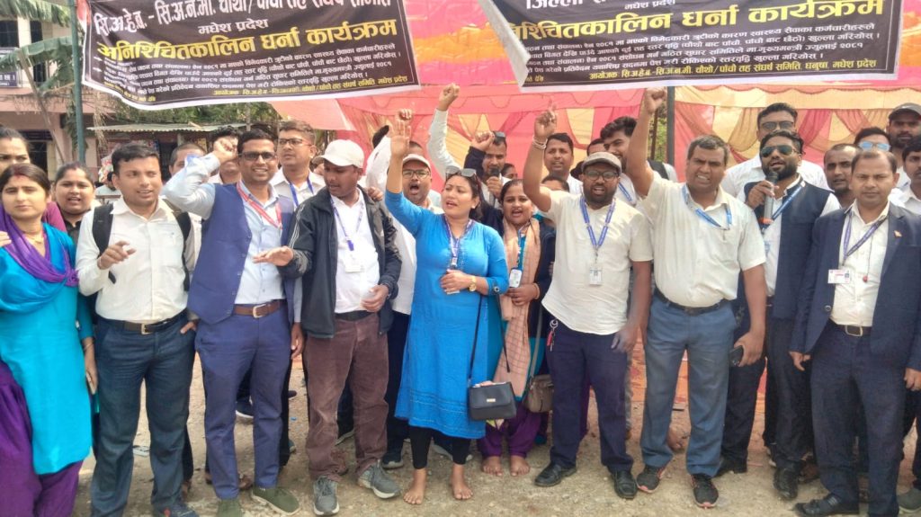 जनकपुरधाम, २७ चैत । मधेश प्रदेश सरकारले हालै कार्यान्वयनमा ल्याएको स्वास्थ्य सेवा ऐन, २०८१ को विरुद्धमा प्रदेशभरका स्वास्थ्यकर्मीहरूले सुरु गरेको अनिश्चितकालीन धर्ना बुधबार तेस्रो दिन पनि जारी रह्यो । आन्दोलनरत स्वास्थ्यकर्मीहरूले उक्त ऐनका प्रावधानहरूले आफूहरूको वृत्ति विकासमा गम्भीर अवरोध उत्पन्न गर्ने भएकाले तत्काल संशोधन गर्नुपर्ने माग गर्दै आन्दोलन चर्काइरहेका छन् ।